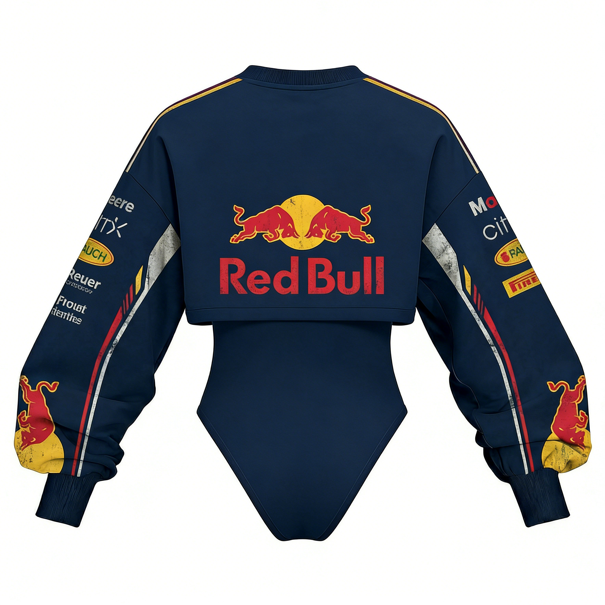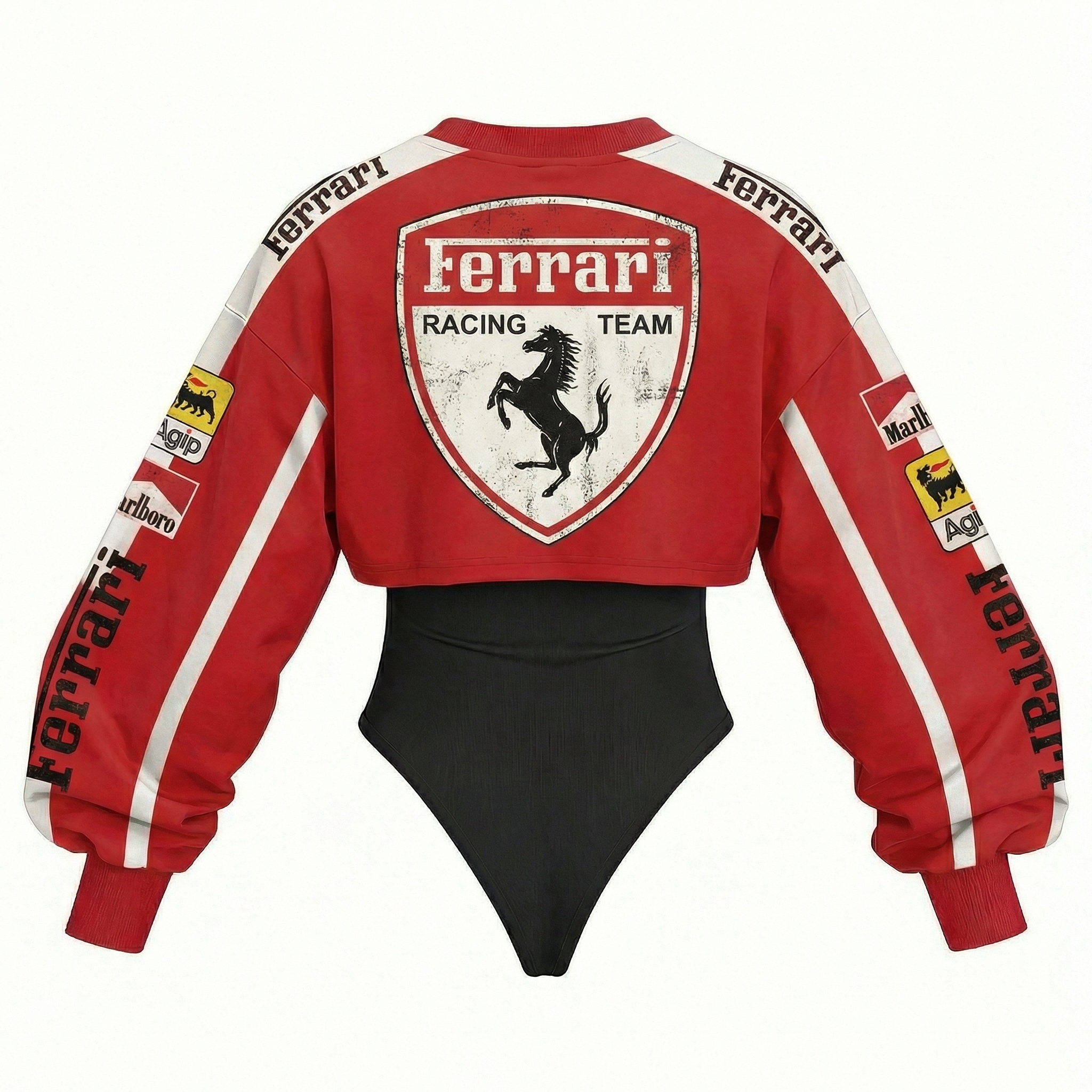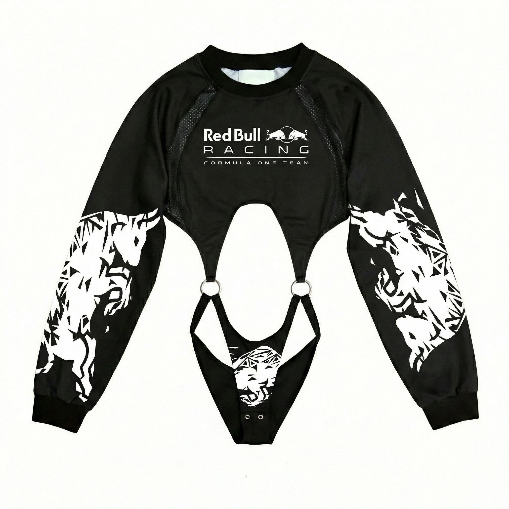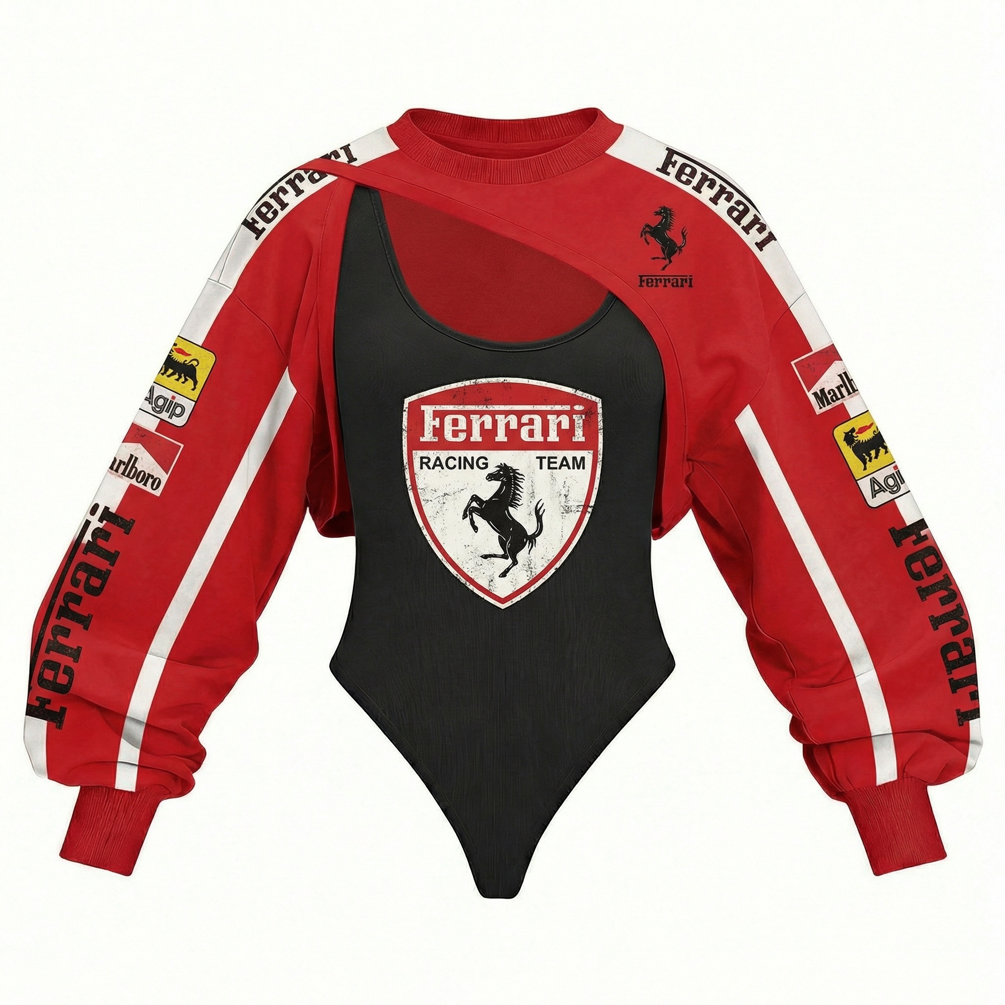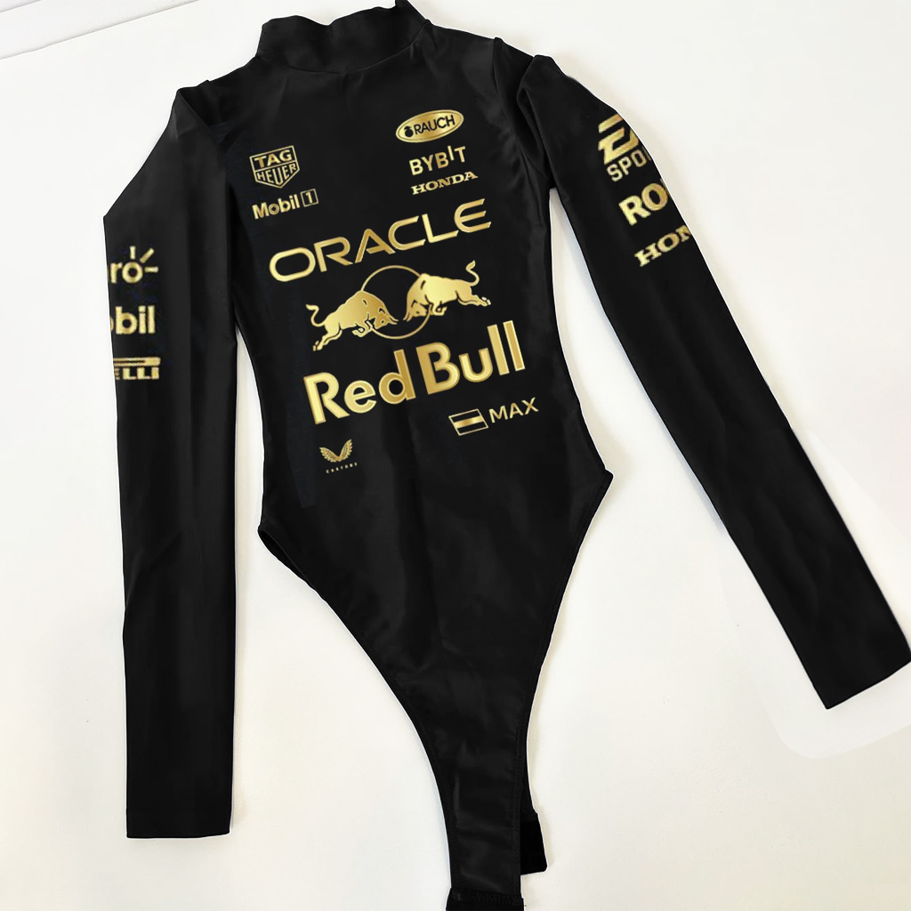 Red Racing-Inspired Long Sleeve Bodysuit with Sponsor Logos and Cutout Design
