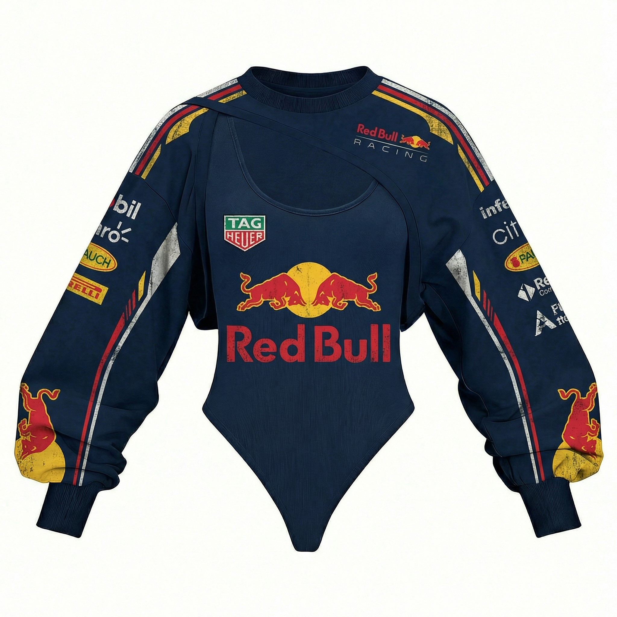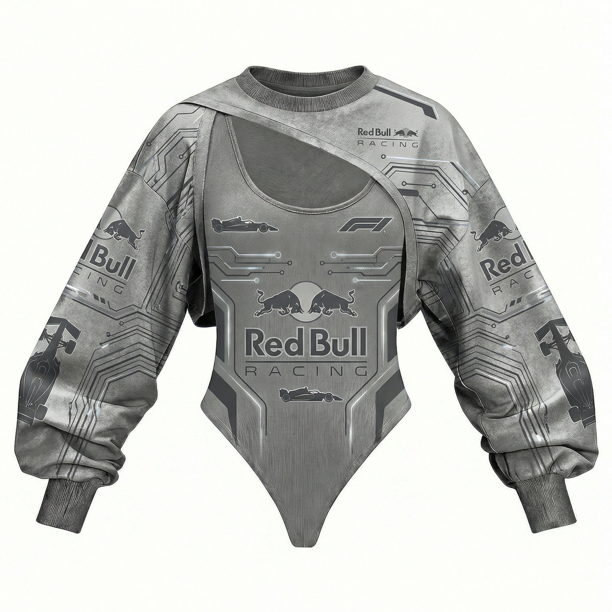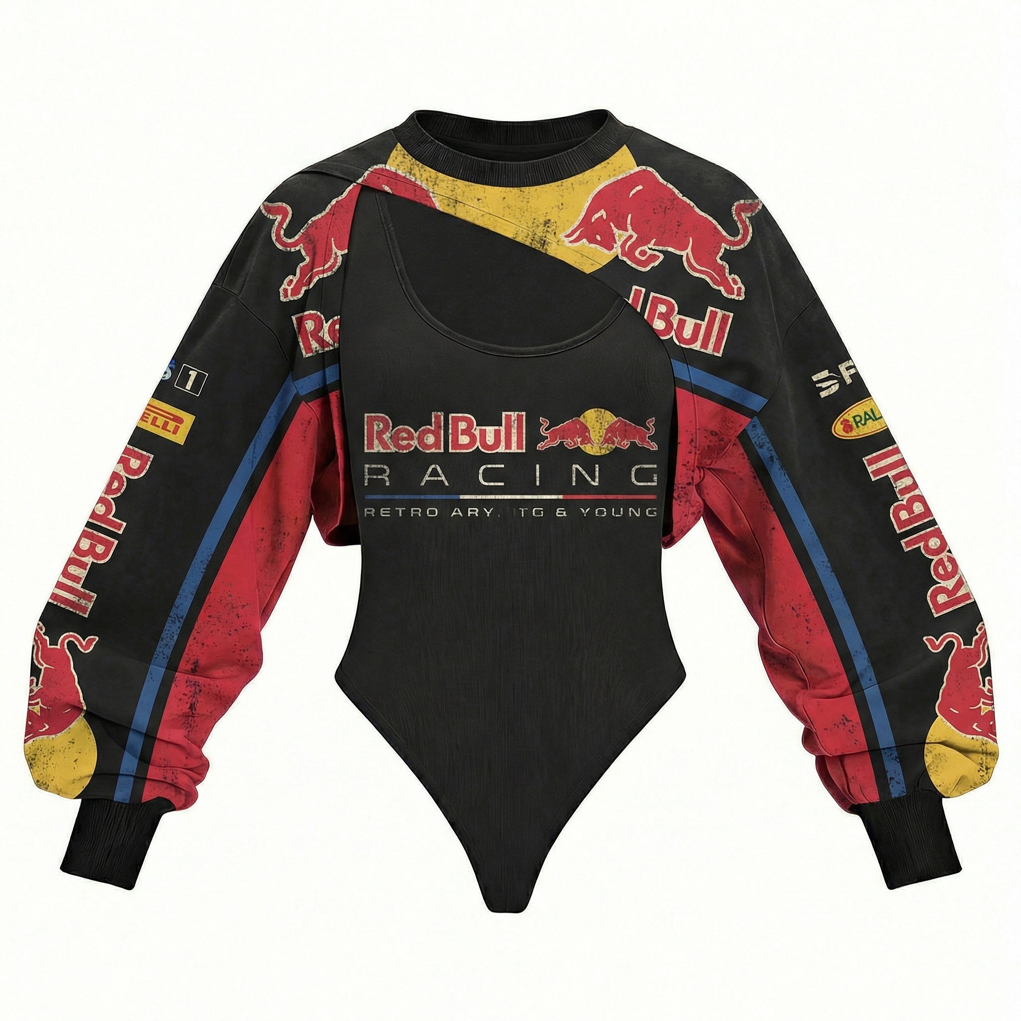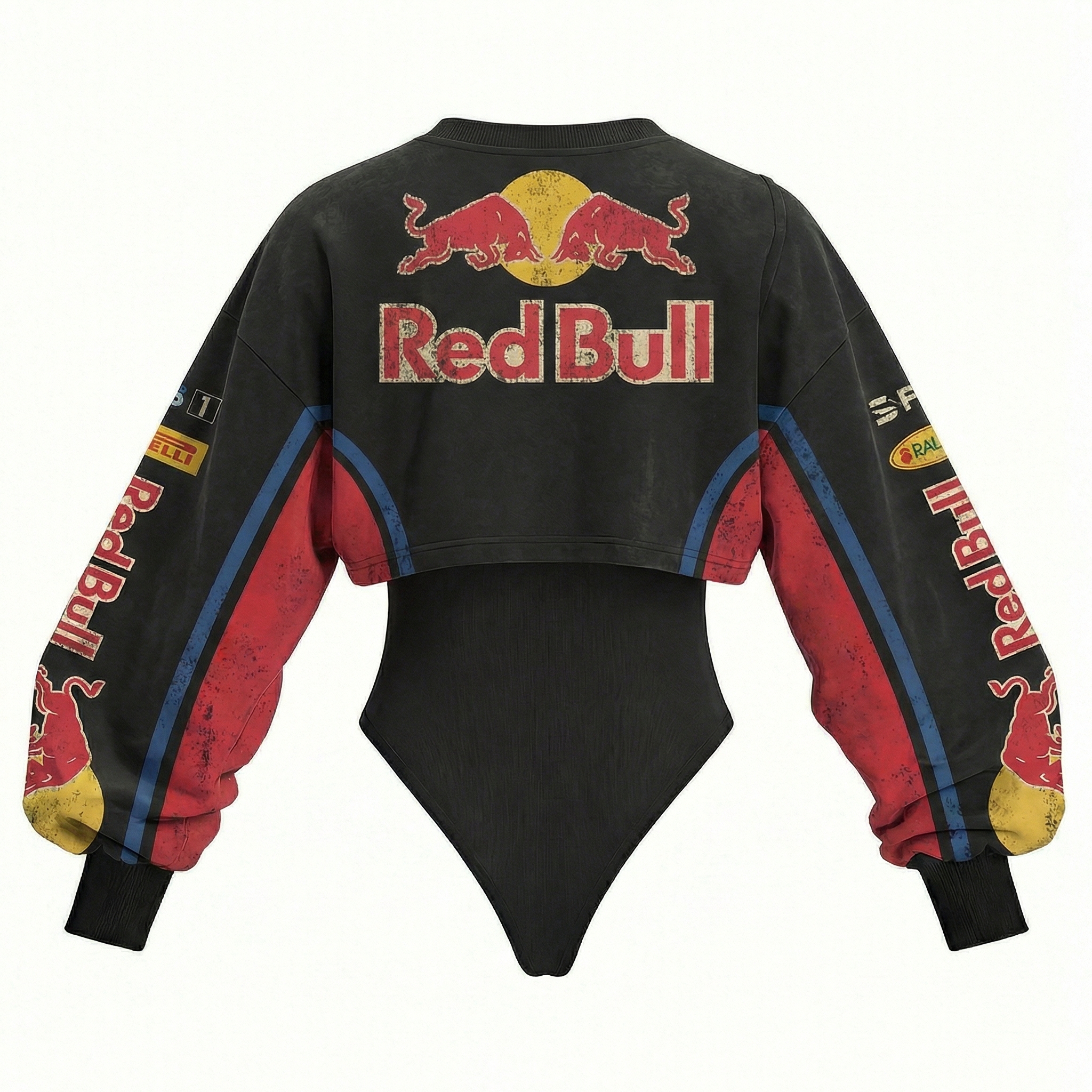 Red Racing-Inspired Long Sleeve Bodysuit with Sponsor Logos and Cutout Design