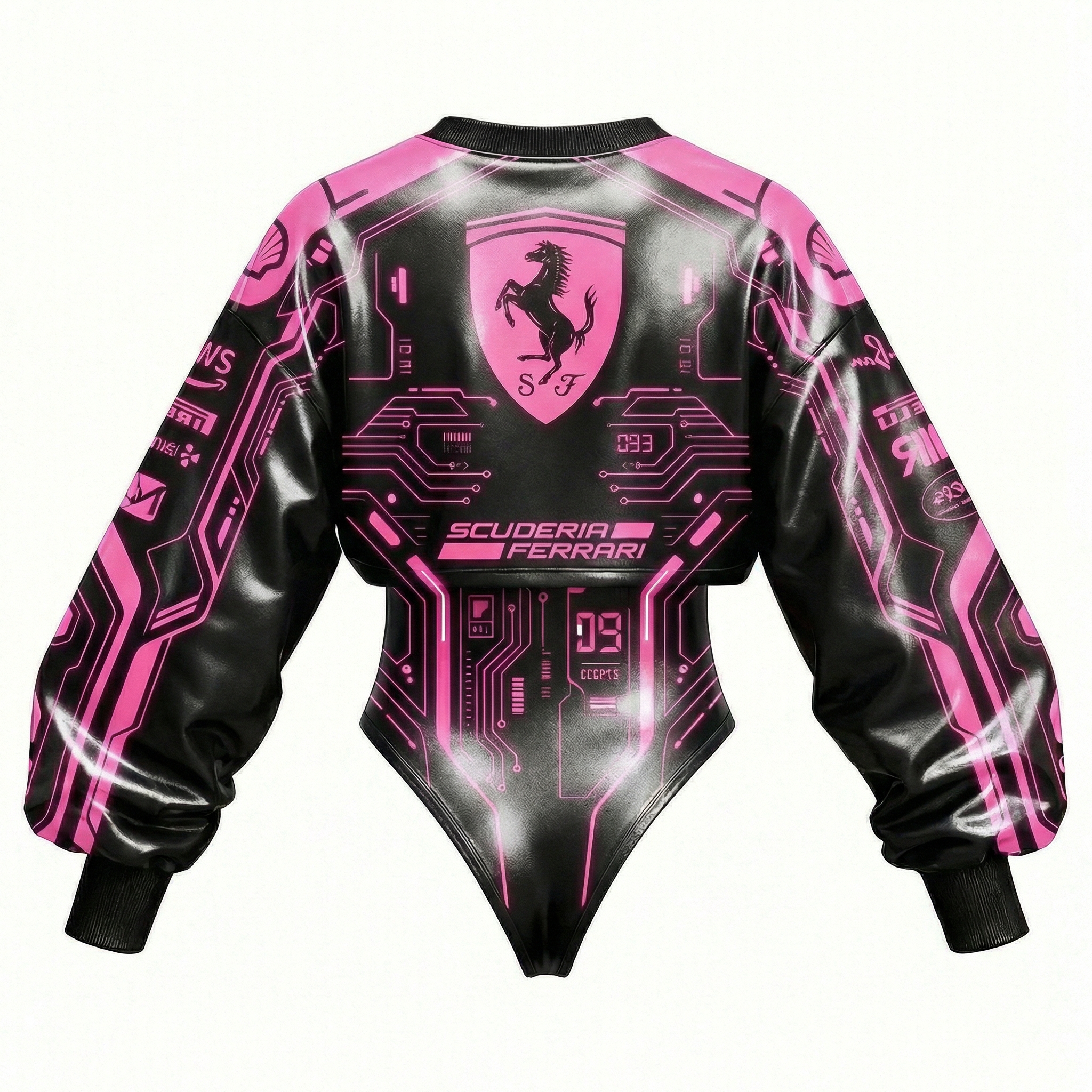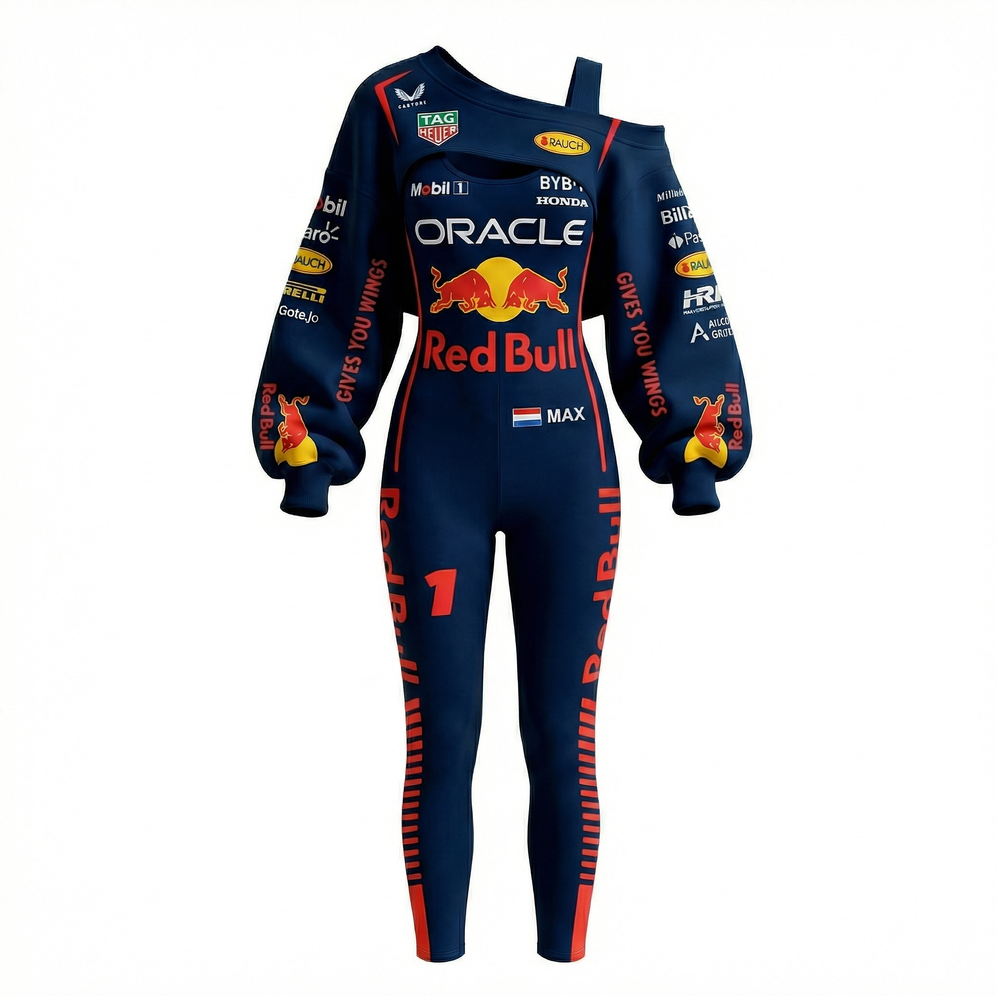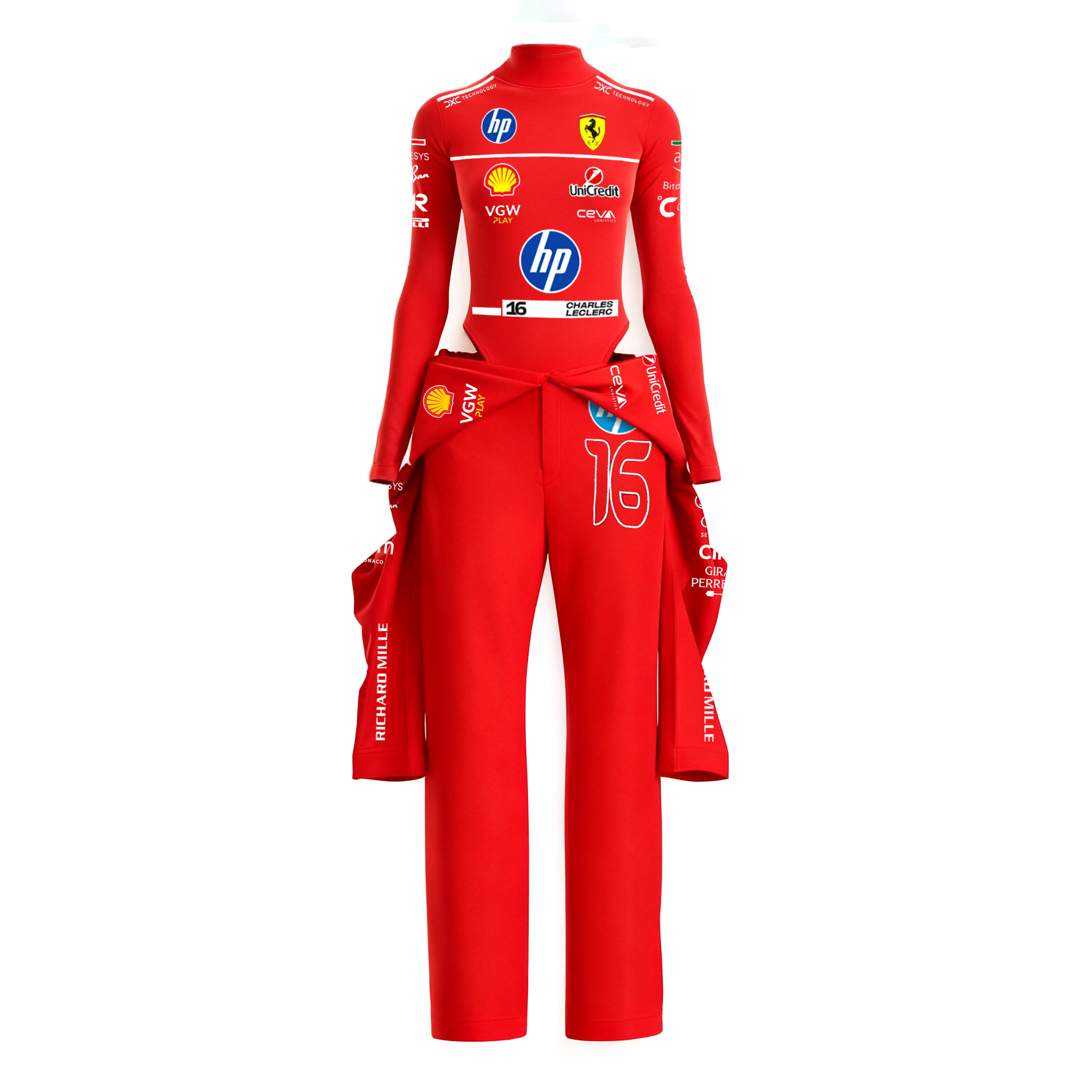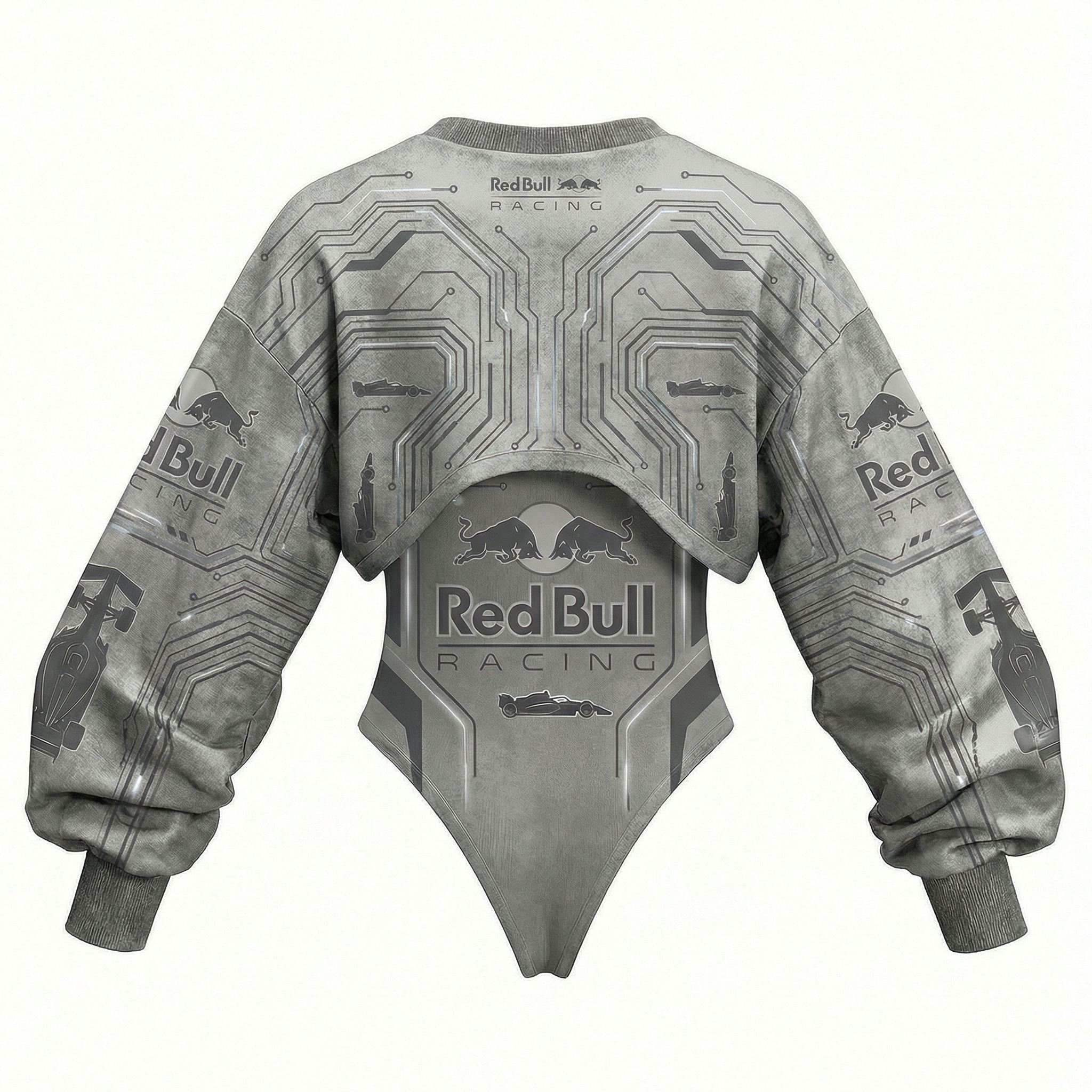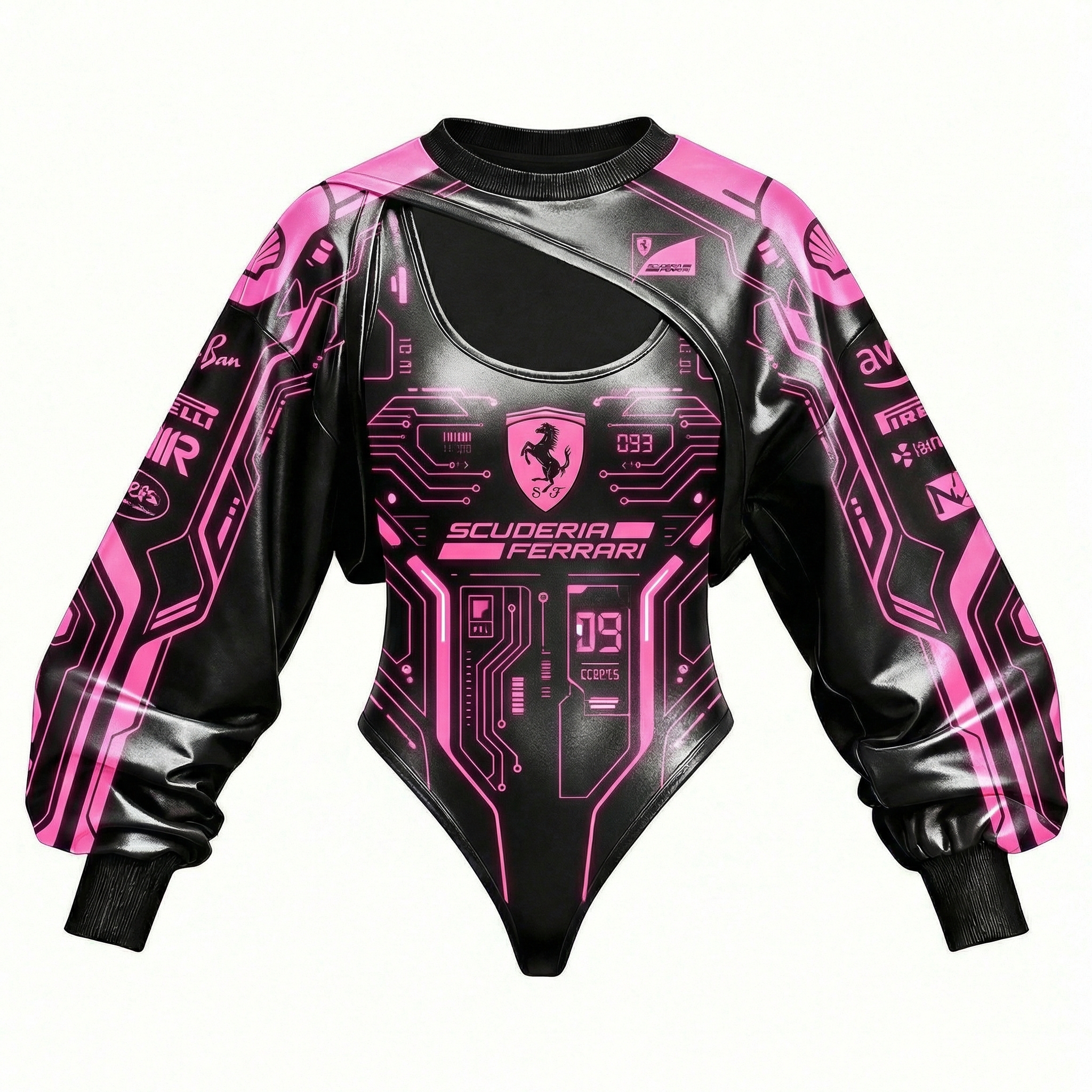 Red Racing-Inspired Long Sleeve Bodysuit with Sponsor Logos and Cutout Design