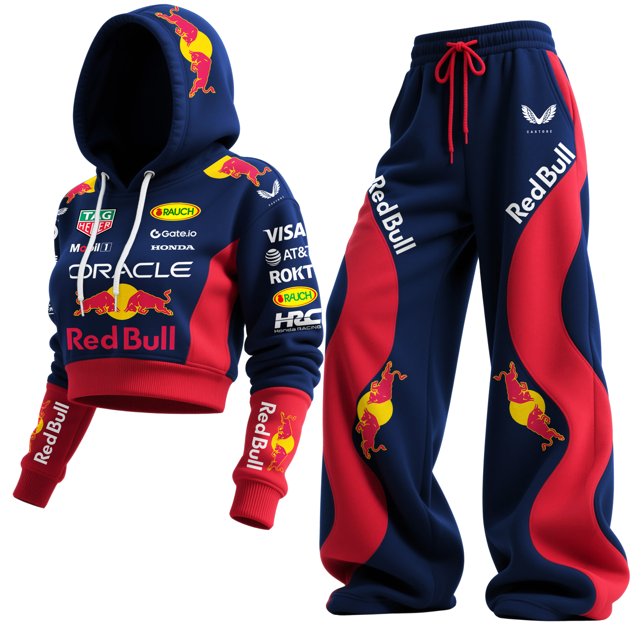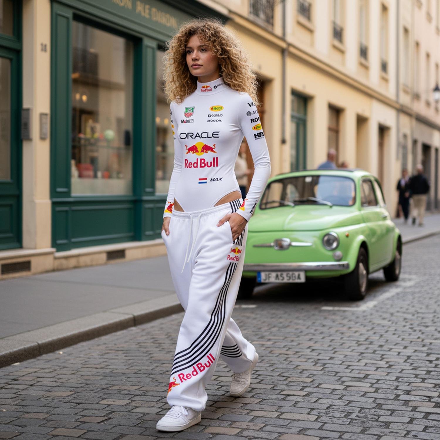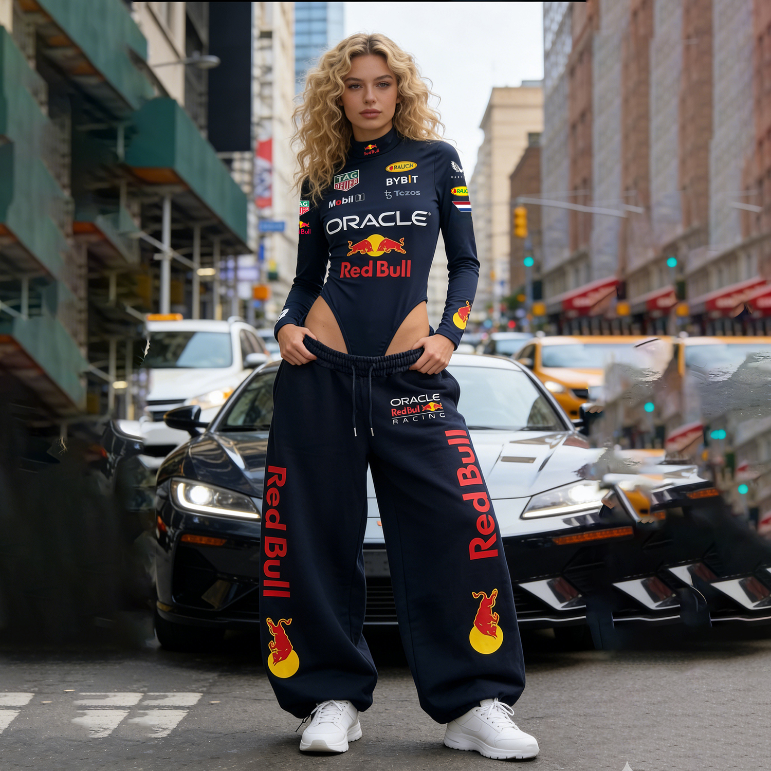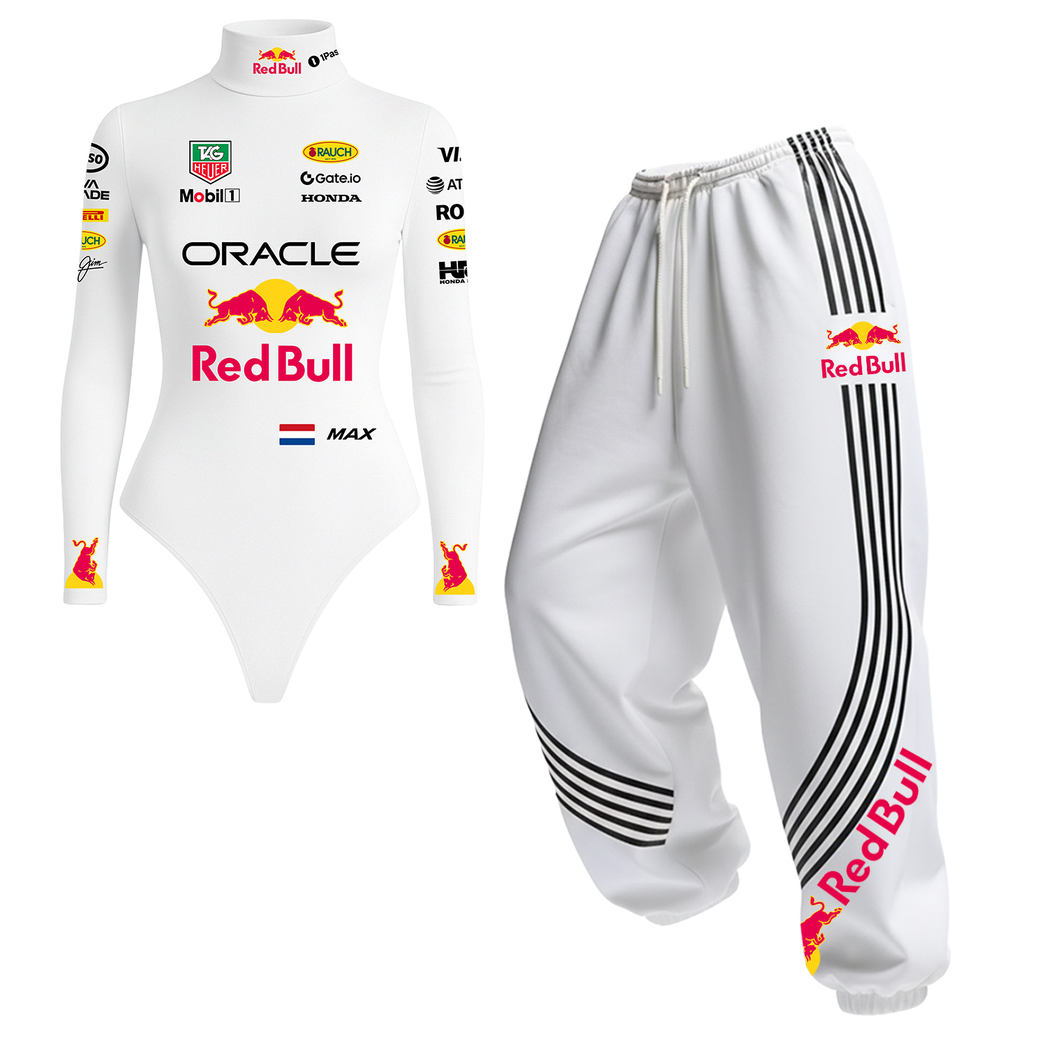 White Racing-Inspired Bodysuit and Sweatpants Set with Bold Logo Design