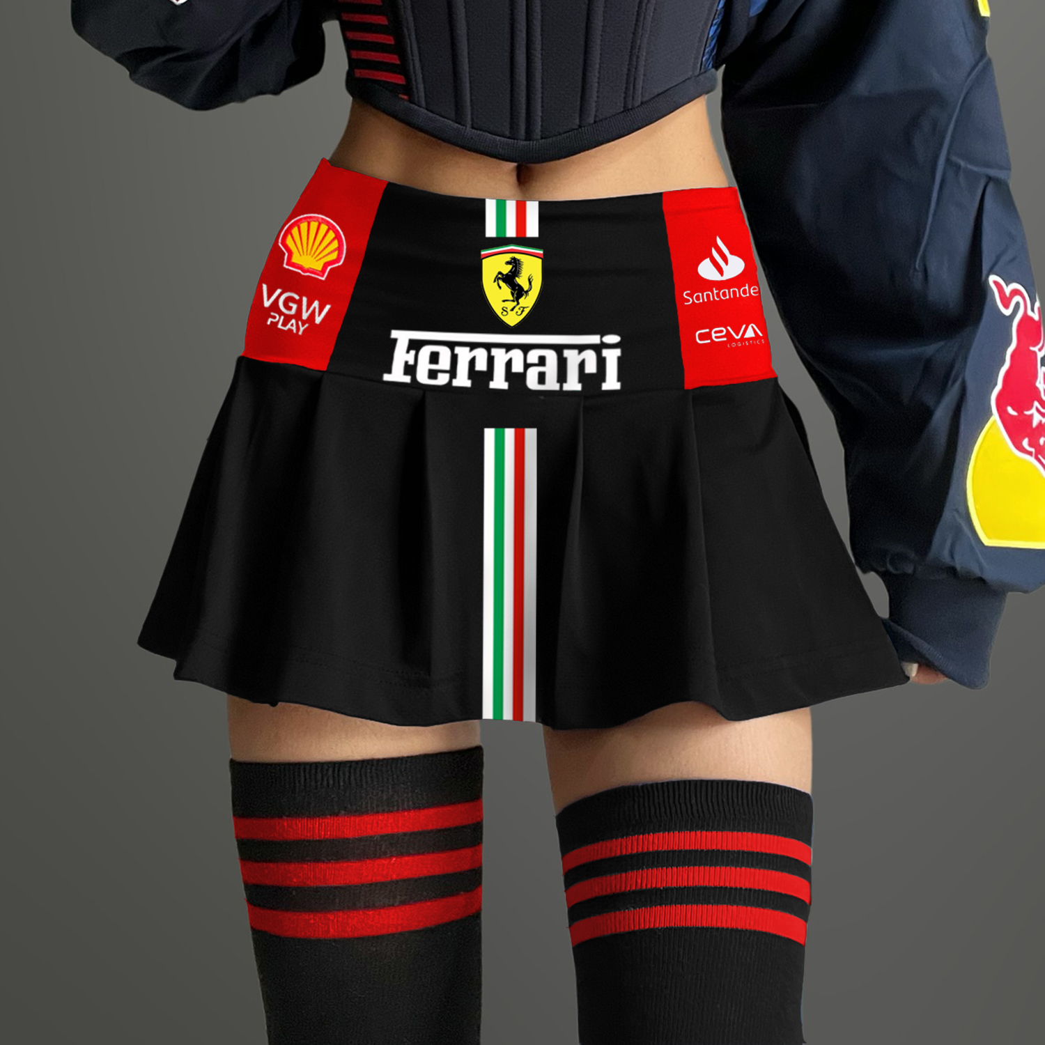 Sporty Racing-Inspired Mini Skirt with Team Logos and Stripes