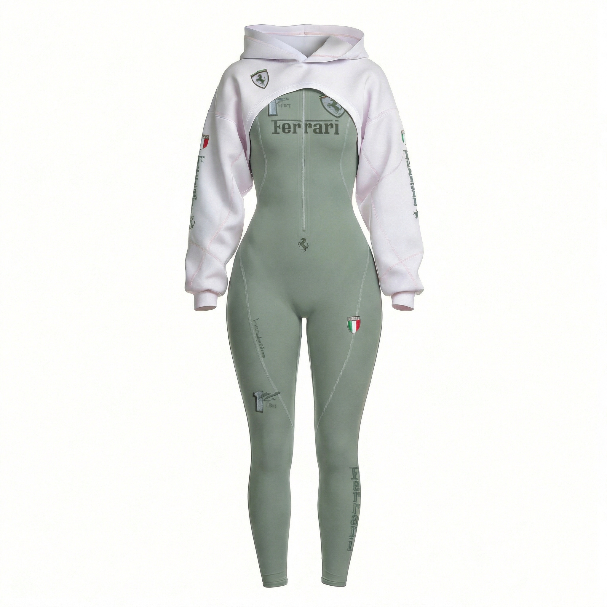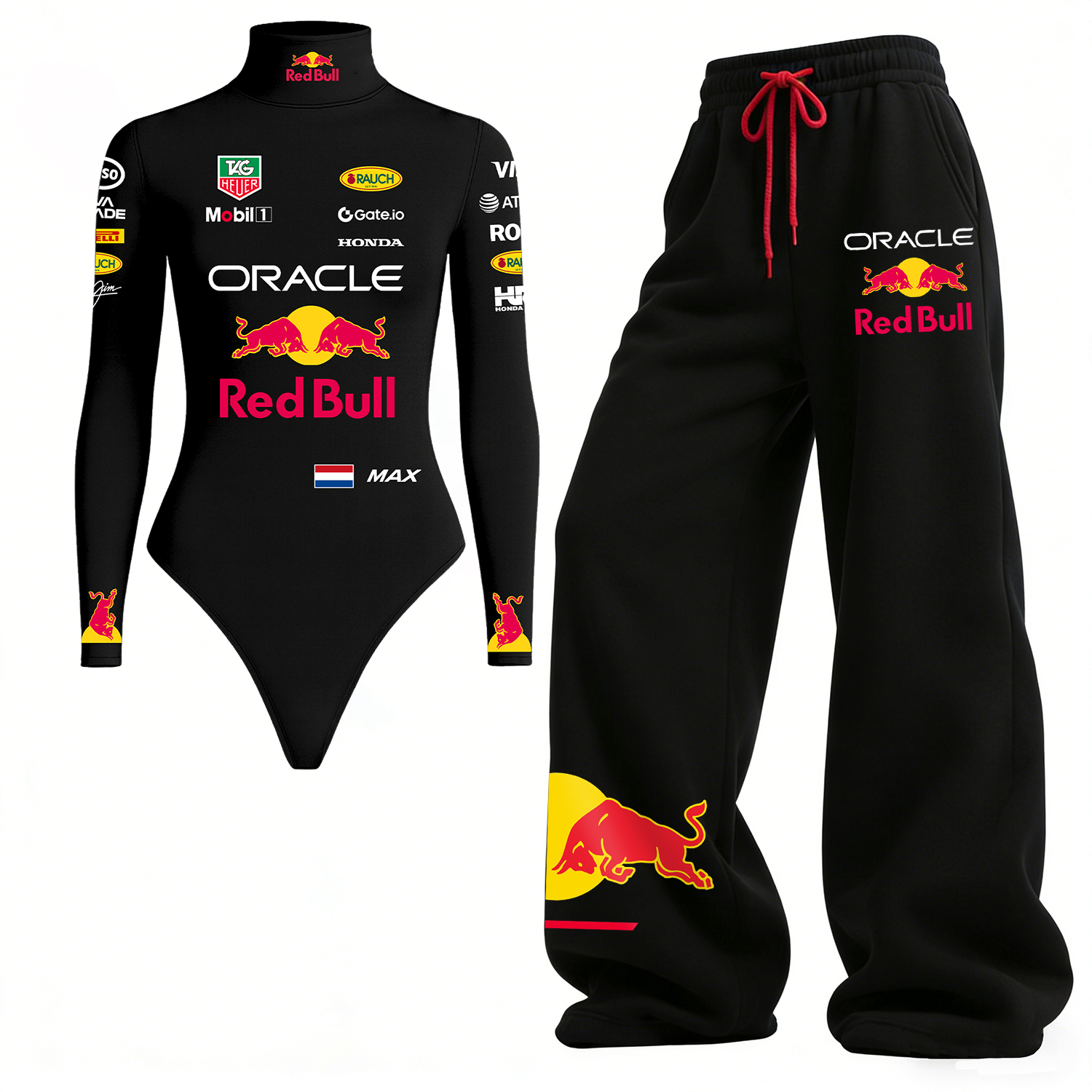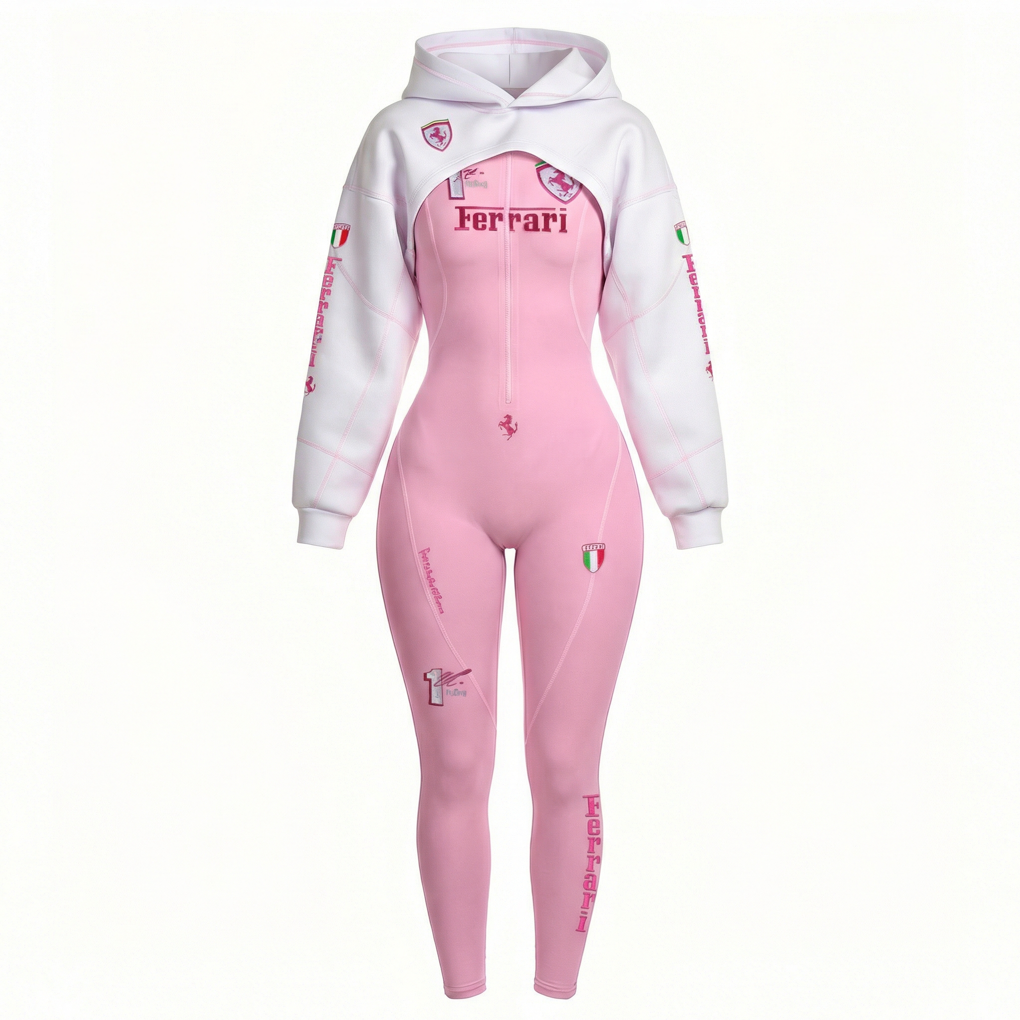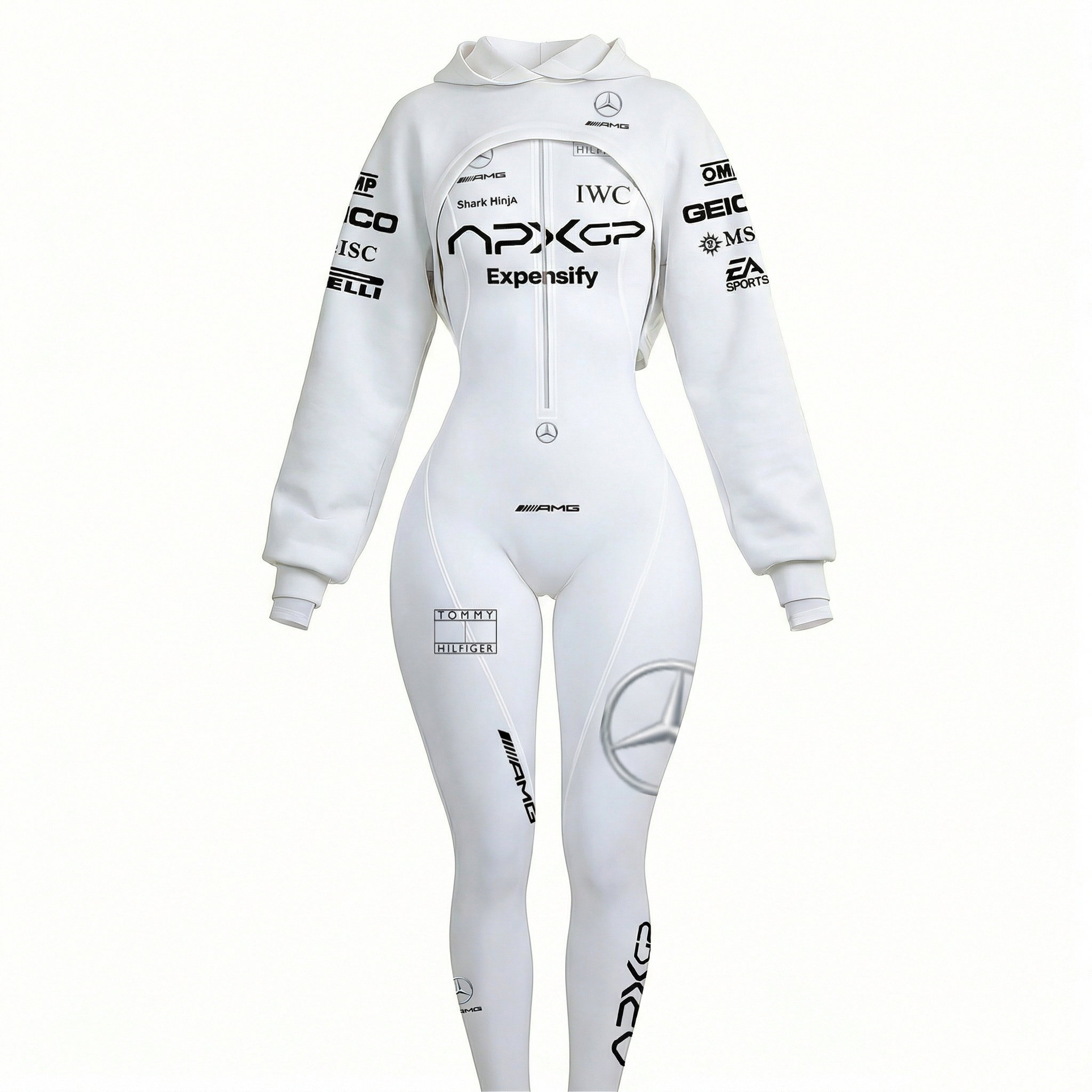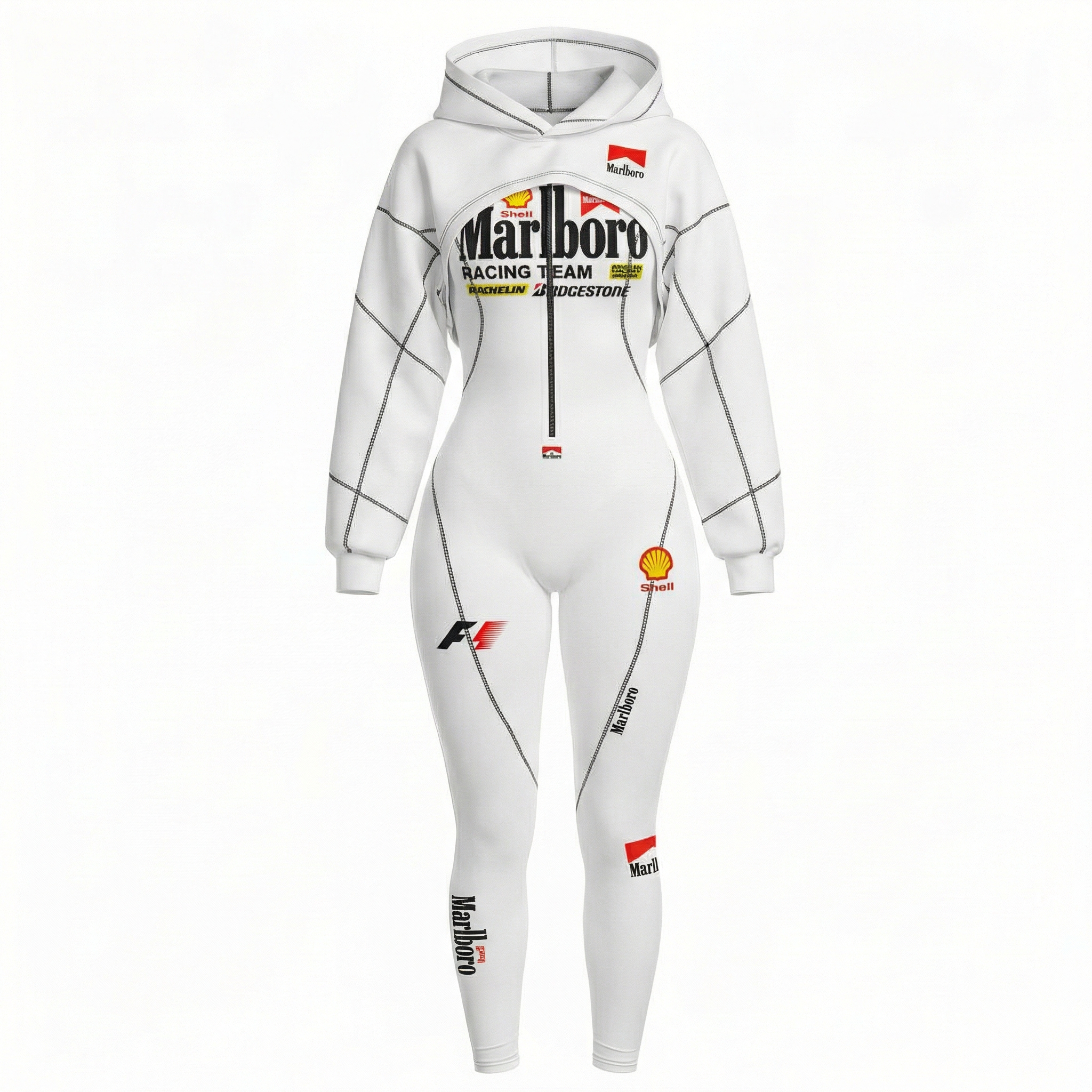 White Racing-Inspired Bodysuit and Sweatpants Set with Bold Logo Design