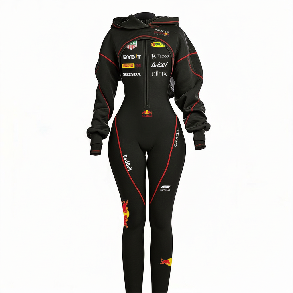 Red Racing-Inspired Hooded One-Piece Suit with Full-Zip Design