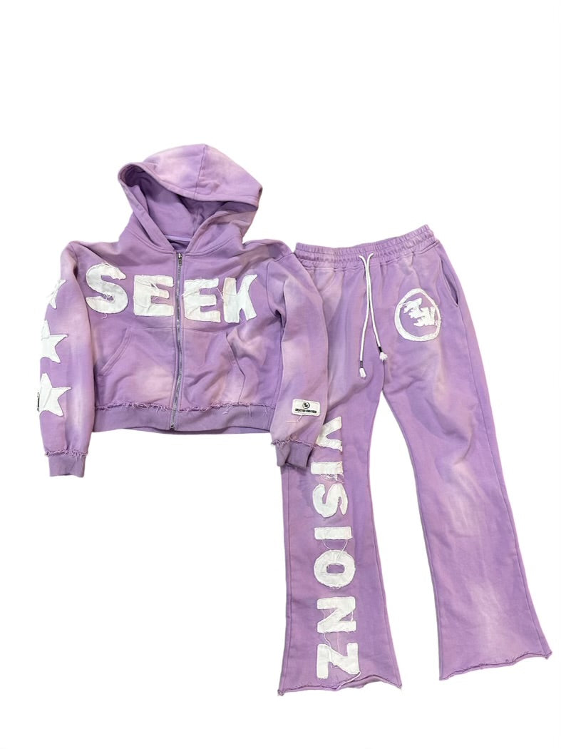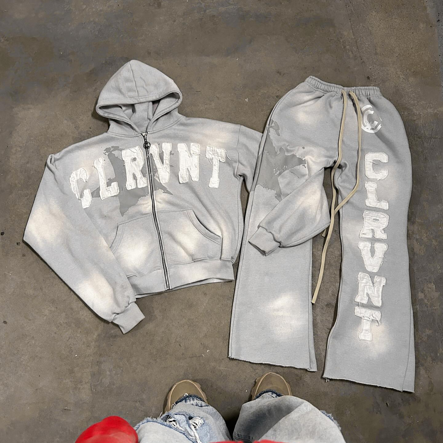 Vintage Gradient Applique Zip-Up Hoodie Two-Piece Set