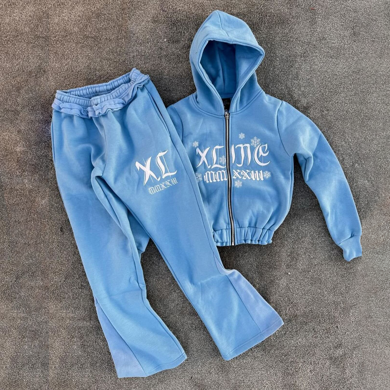 Vintage Snowflake Print Zip-Up Hoodie Set