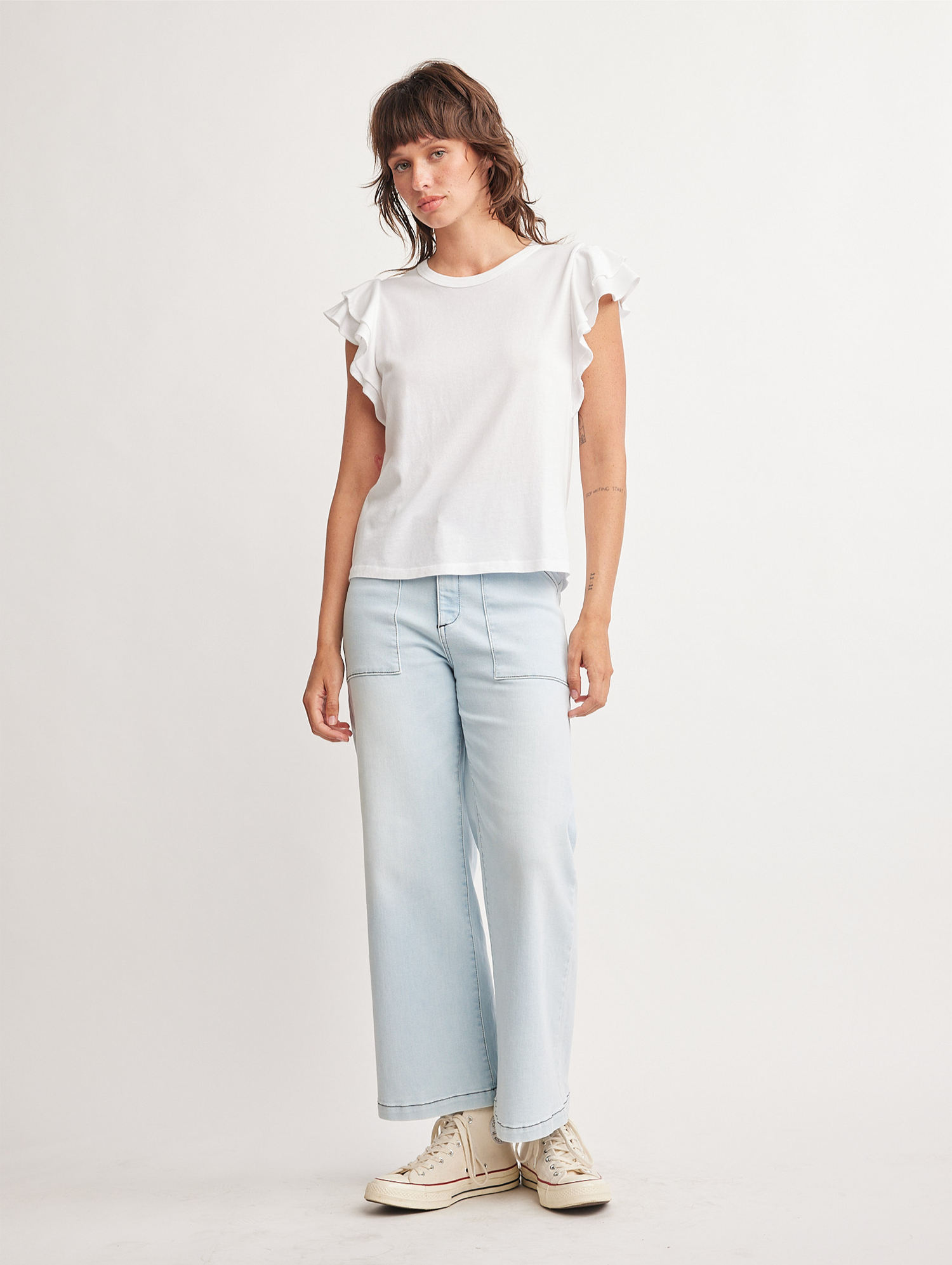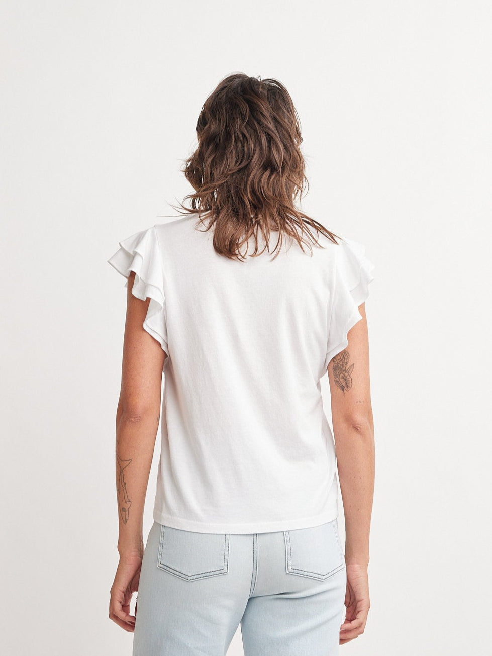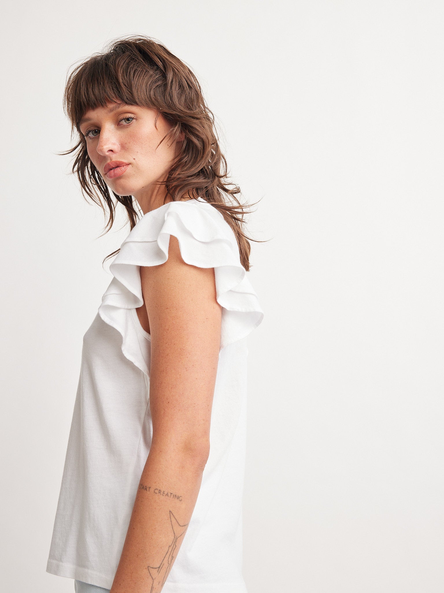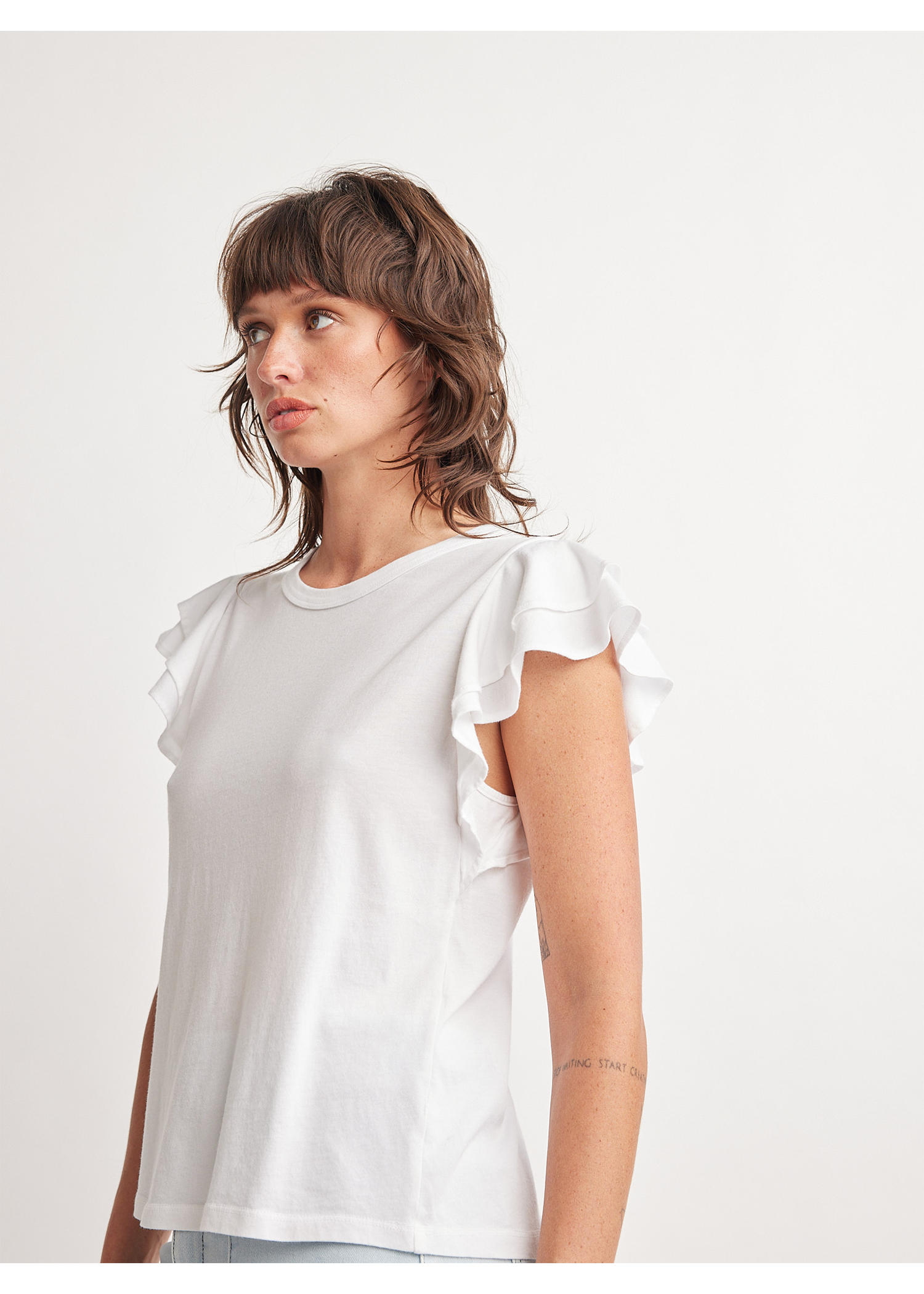 Alondra Tee is a soft white cotton top with a playful and feminine twist. It features a classic crew neckline and a relaxed, slightly boxy silhouette for an easy, breathable fit. The standout detail is the double-layered ruffle sleeves, which add a touch of romantic flair and movement without feeling overdone. It's a versatile piece — sweet enough to dress up, comfy enough for everyday wear.