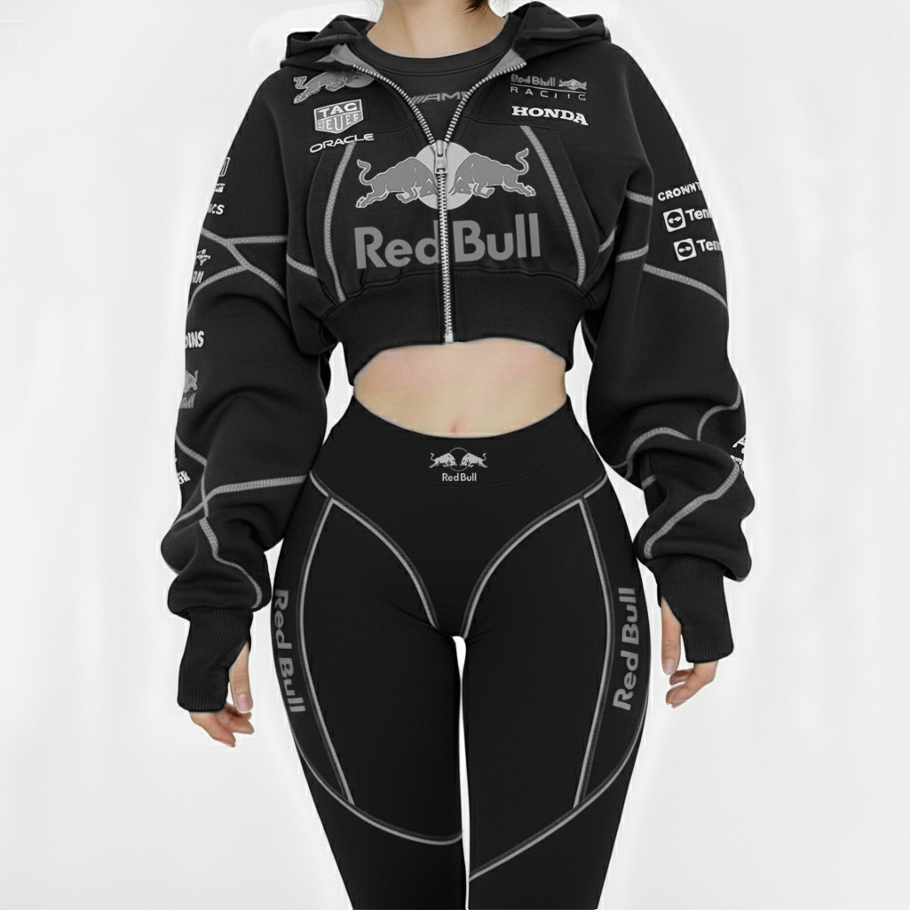 Cotton Blend Racing Zip-Up Hoodie & Shorts Set for Women - Sporty Casual Tracksuit with Logo Print
