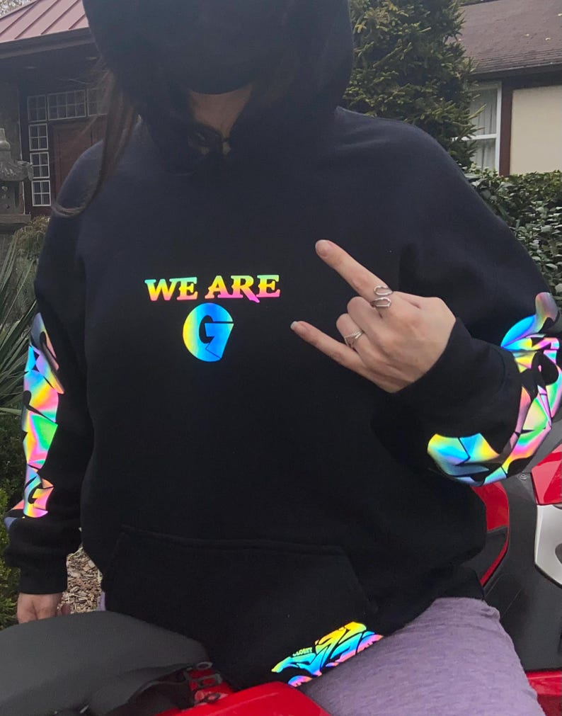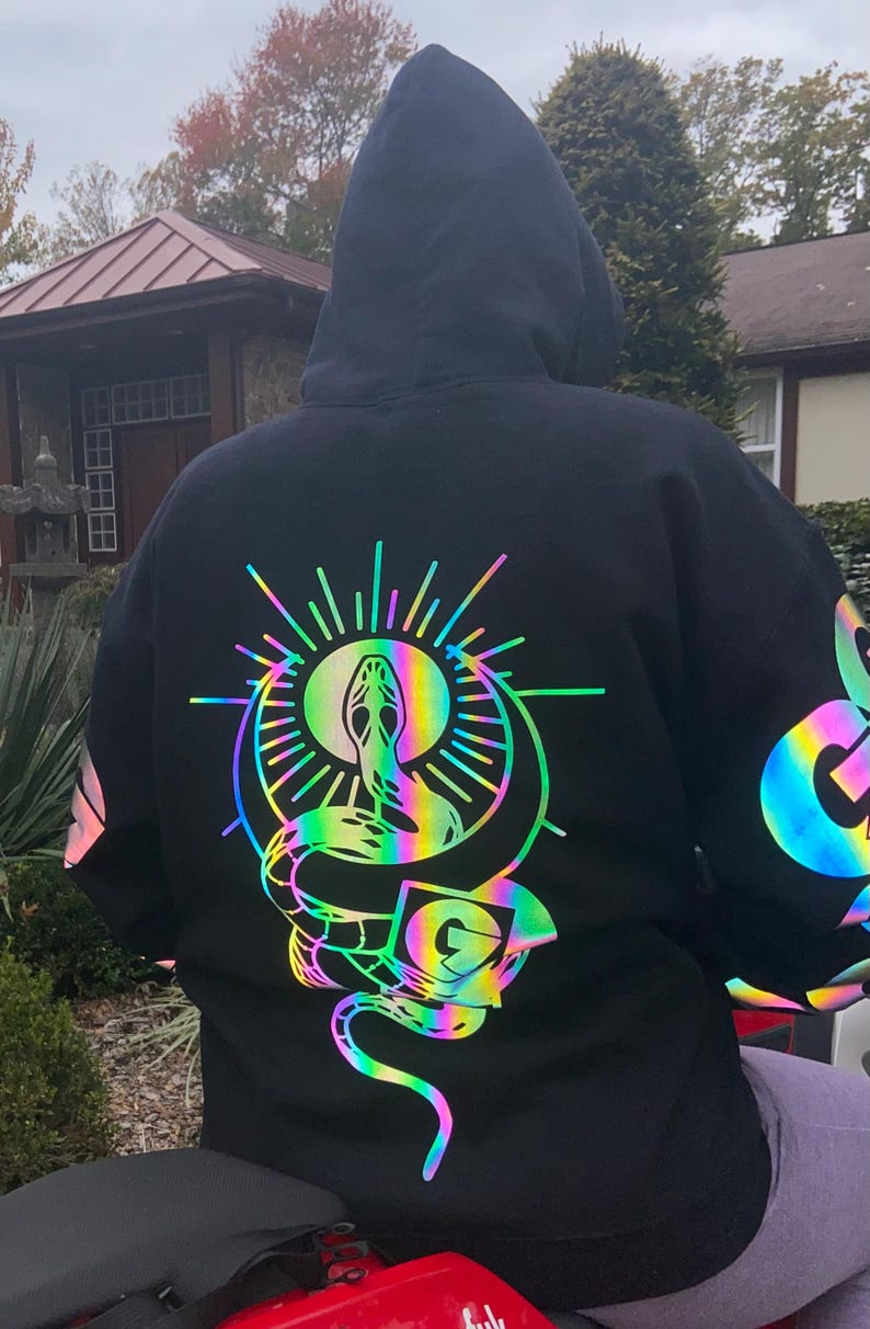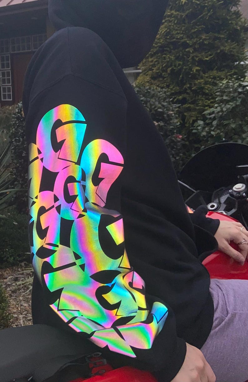 This hoodie features rainbow reflective designs strategically placed on the hoodie to make you visible from the front side and back.