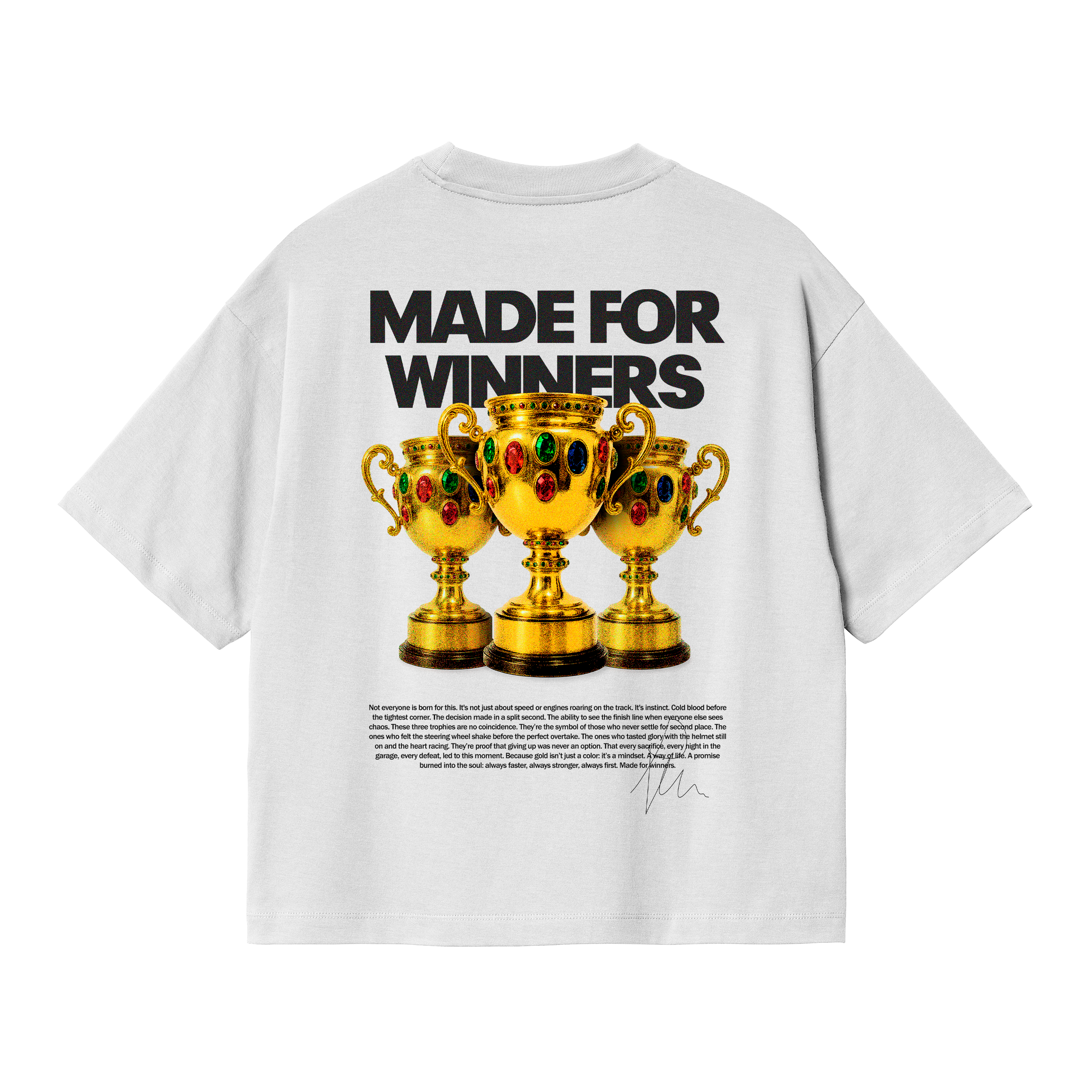 A tribute to the ones who never settle, this tee celebrates the mindset of champions with its bold “MADE FOR WINNERS” statement and three golden trophies that speak louder than words. Each detail in the back print reflects ambition, glory, and the thrill of victory, brought to life with premium printing techniques for lasting impact.
