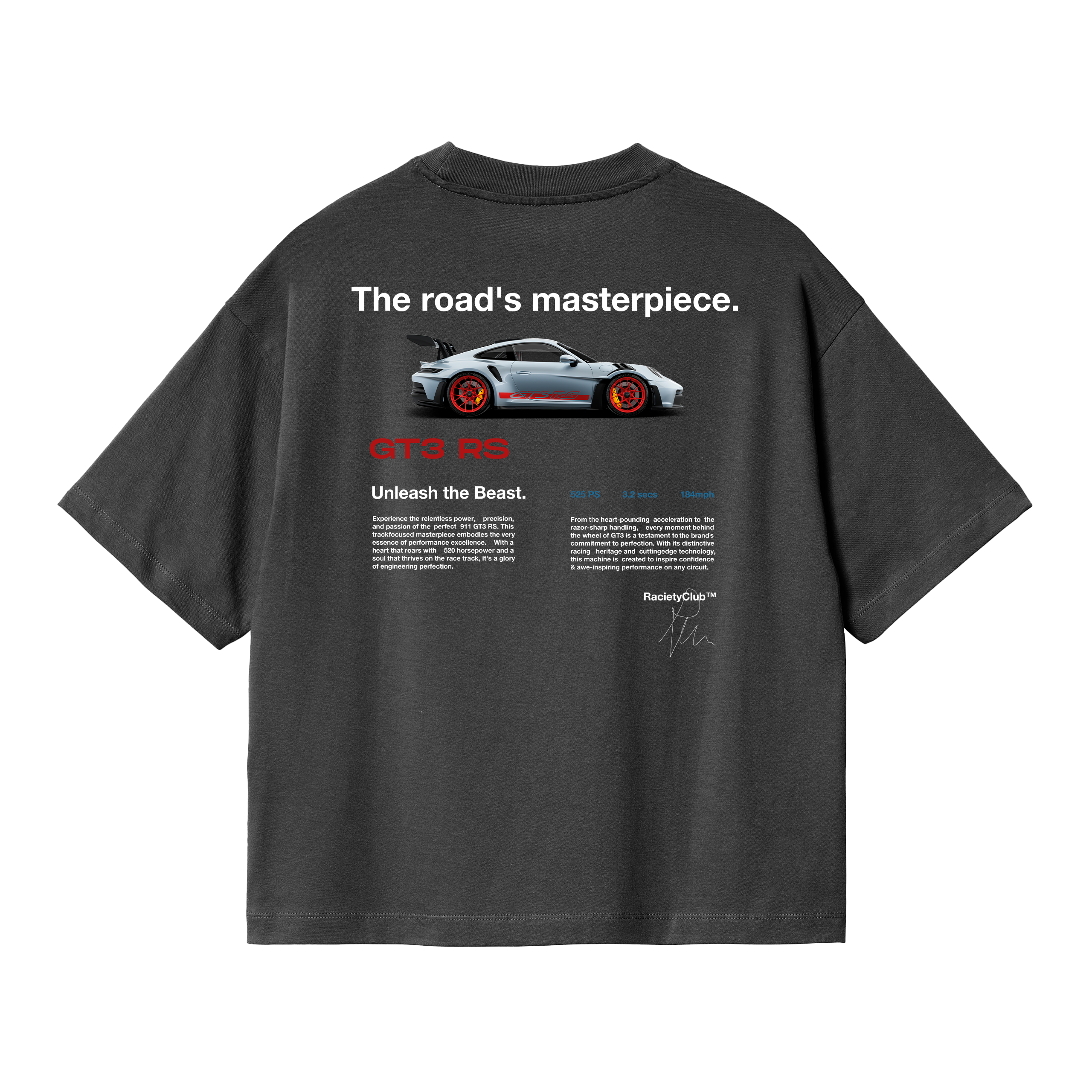 This t-shirt make homage to the legendary 911 GT3 RS with unparalleled attention to detail. Every line, curve, and aerodynamic feature of the iconic sports car has been faithfully recreated with astonishing precision. From the distinctive rear spoiler to the iconic front headlights, this t-shirt captures the essence of the 911 GT3 RS in a way that only a true automotive enthusiast can truly appreciate. Wear it proudly and showcase your devotion to automotive perfection with unmatched style.
