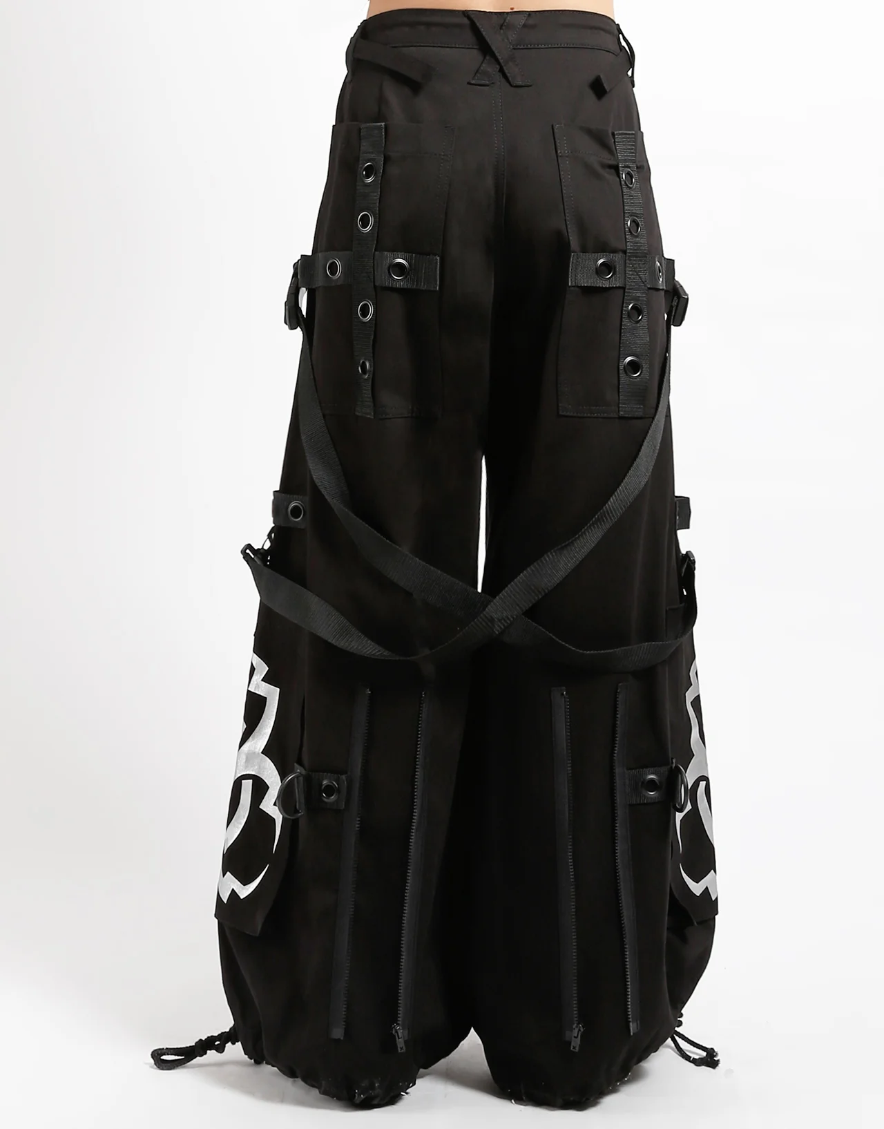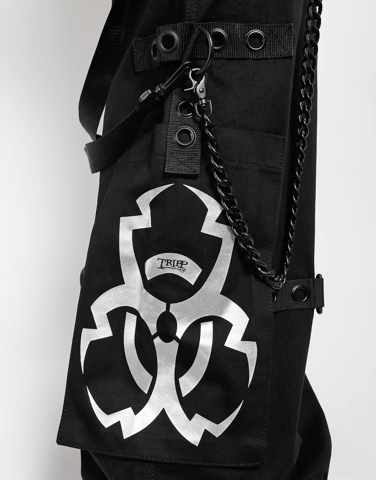 These black pants feature a silver metallic y2k biohazard symbol on each leg. A techno twist with removable oversized black plastic chains and zippers, nylon straps, adjustable ankles, D-rings, and deep pockets.