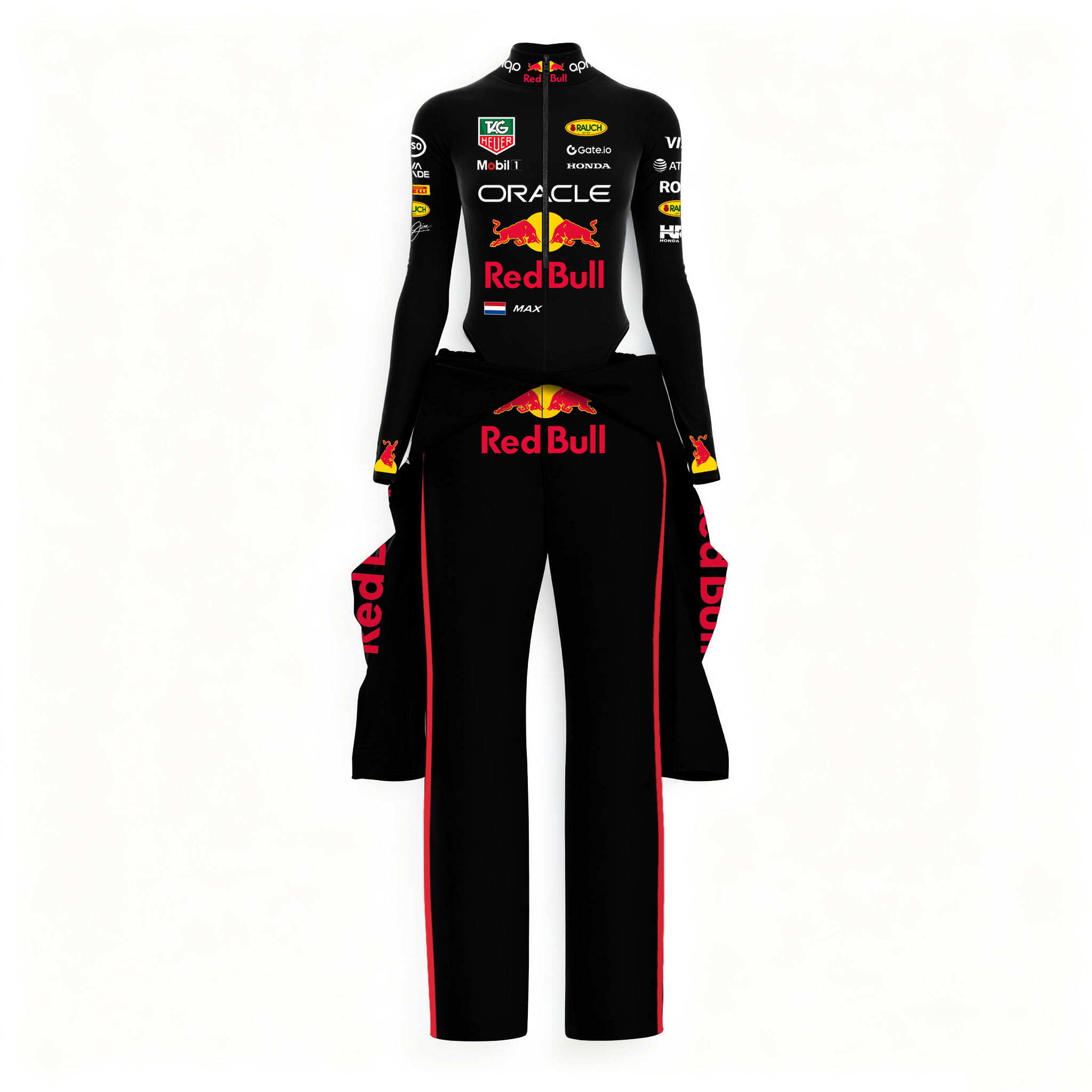 • Design Elements: Branded logos and text, sleek silhouette, adjustable waist tie