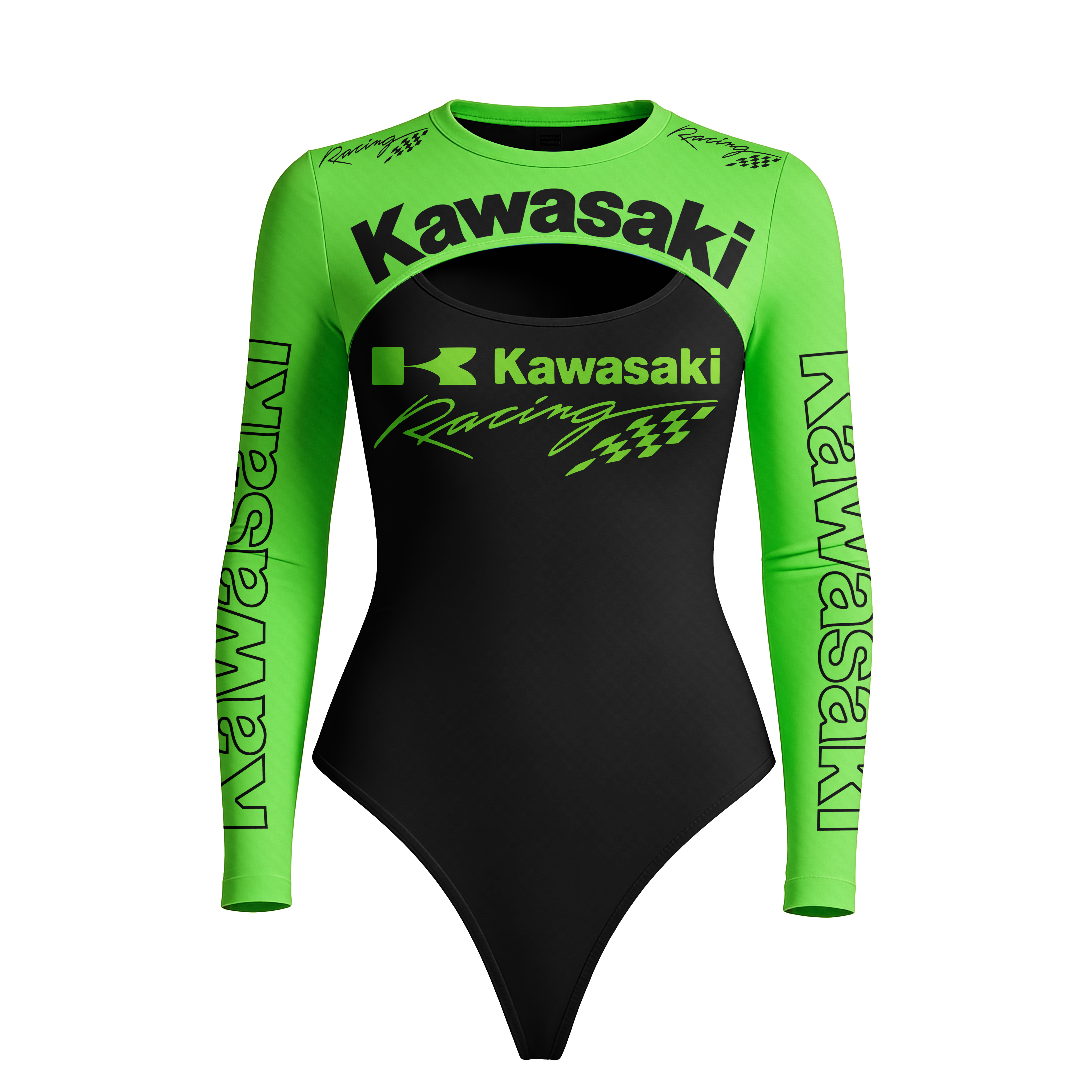 • Detail Features: Chest Cut-Out Design, Full-Length Sleeves, Vertical Logo Print on Arms, Multiple Brand Emblems Across Front, High Neckline