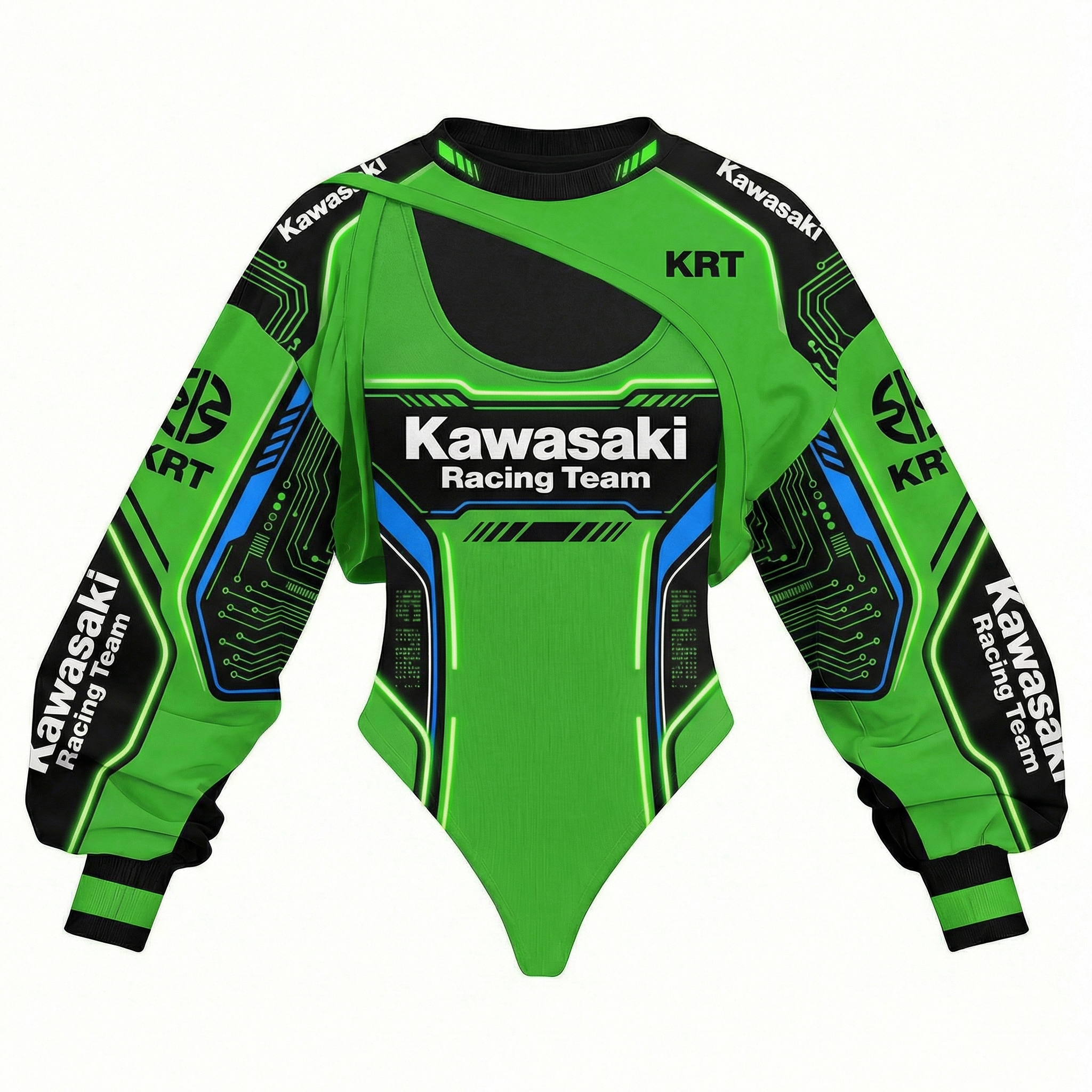 Retro Racing Inspired Long Sleeve Bodysuit with Bold Color Blocking Design