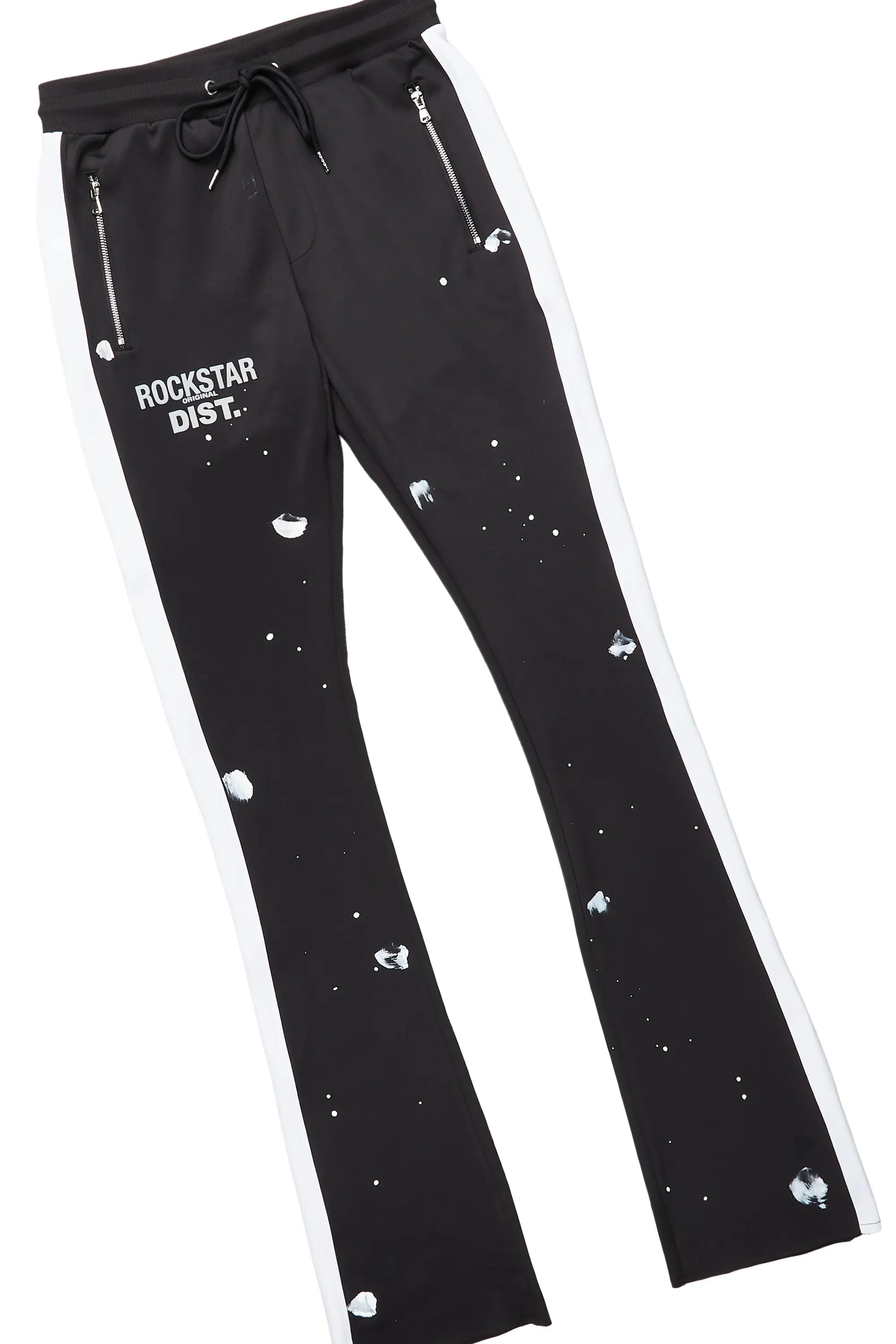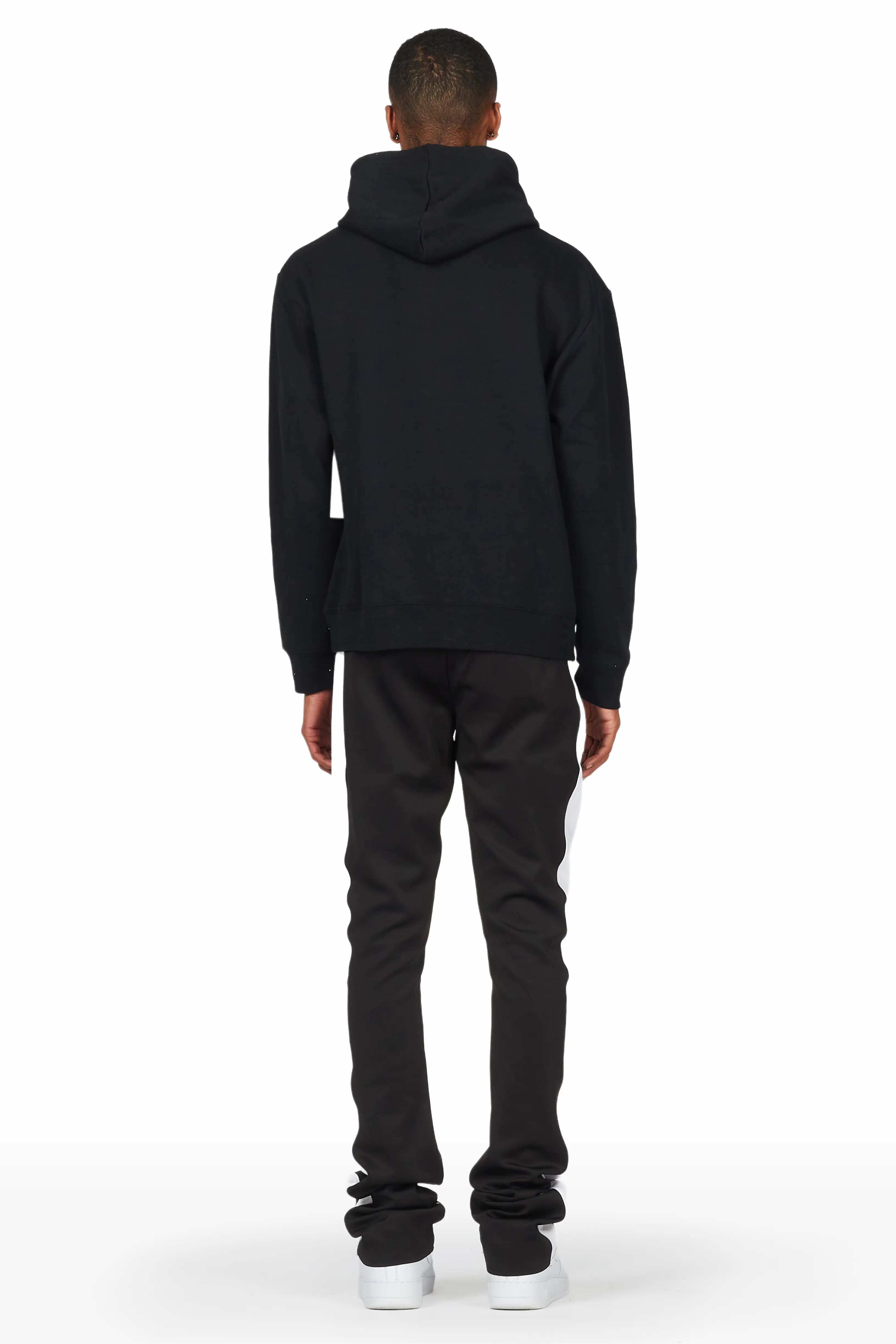 An urban two-piece super stack flare track set for men in black. Designed with extra long legs and worn-in wash for a dope streetwear set.