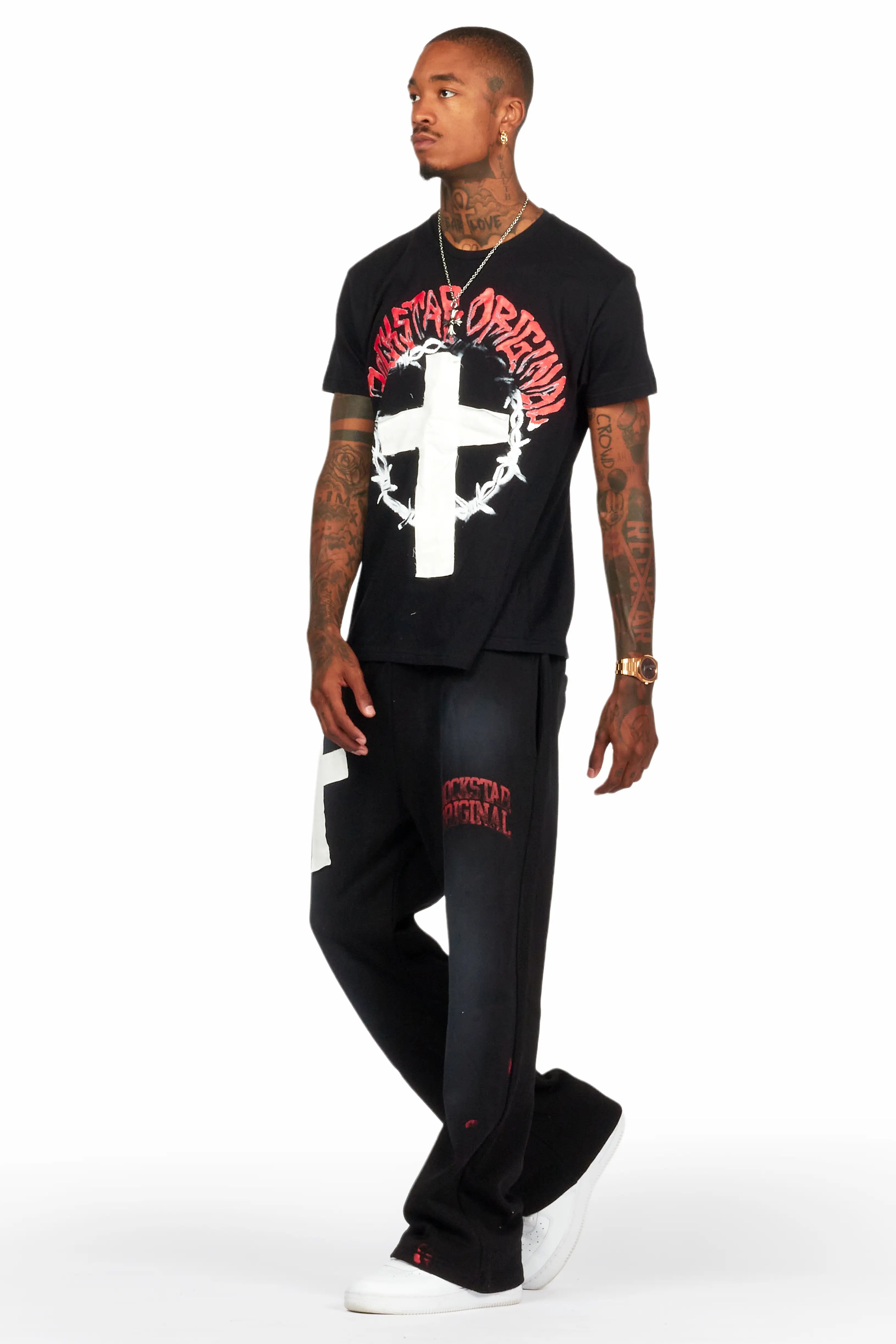 An urban two-piece t-shirt and stacked pant tracksuit set for men in black. Designed with ultra soft fabric and extra long legs for a dope streetwear set.