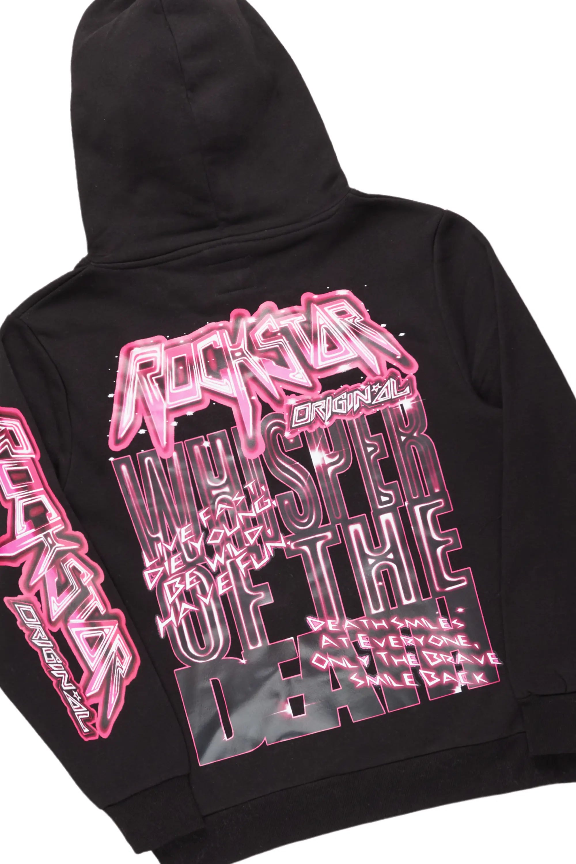 An urban two-piece super stack flare track set for men in black. Designed with extra long legs and worn-in wash for a dope streetwear set.