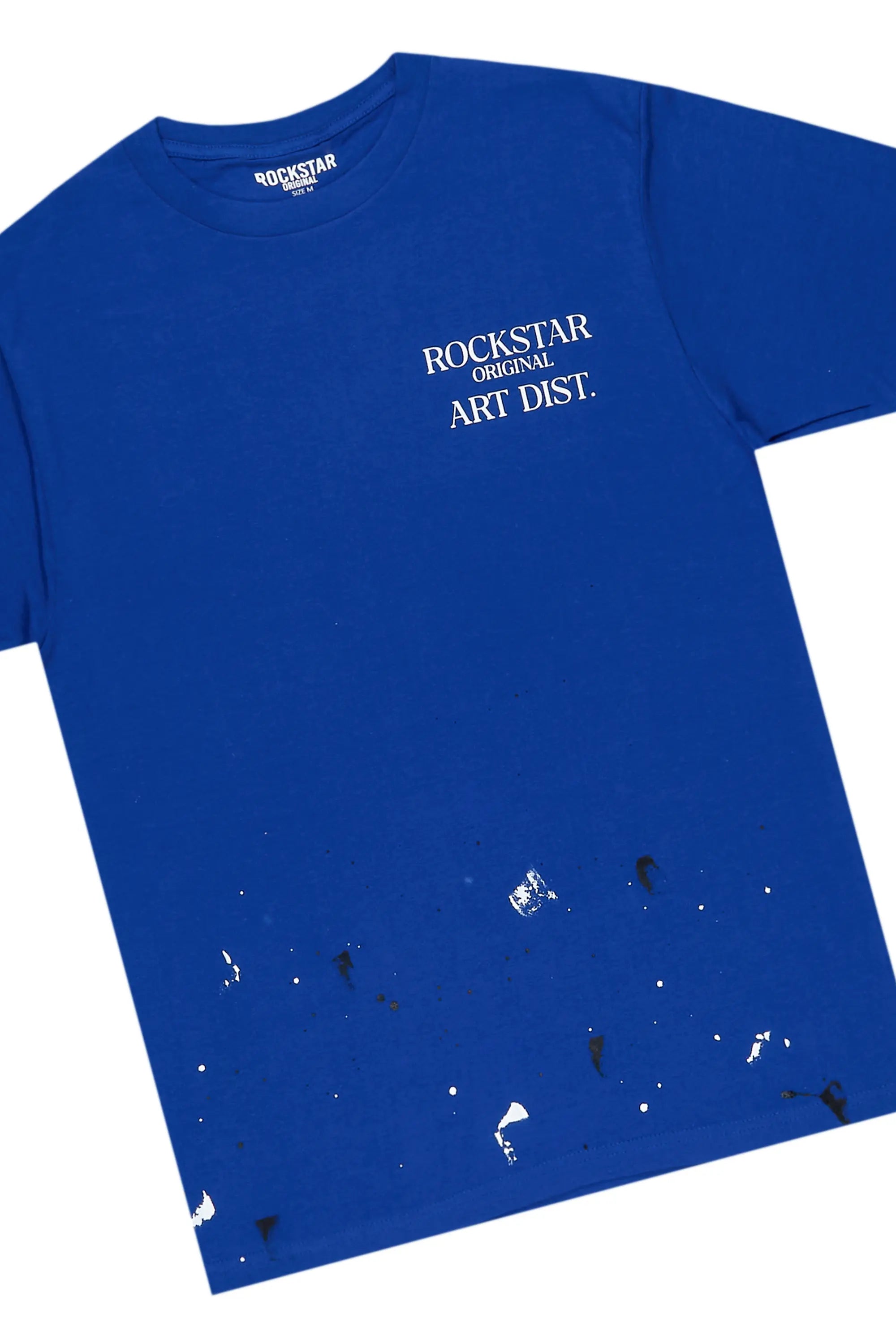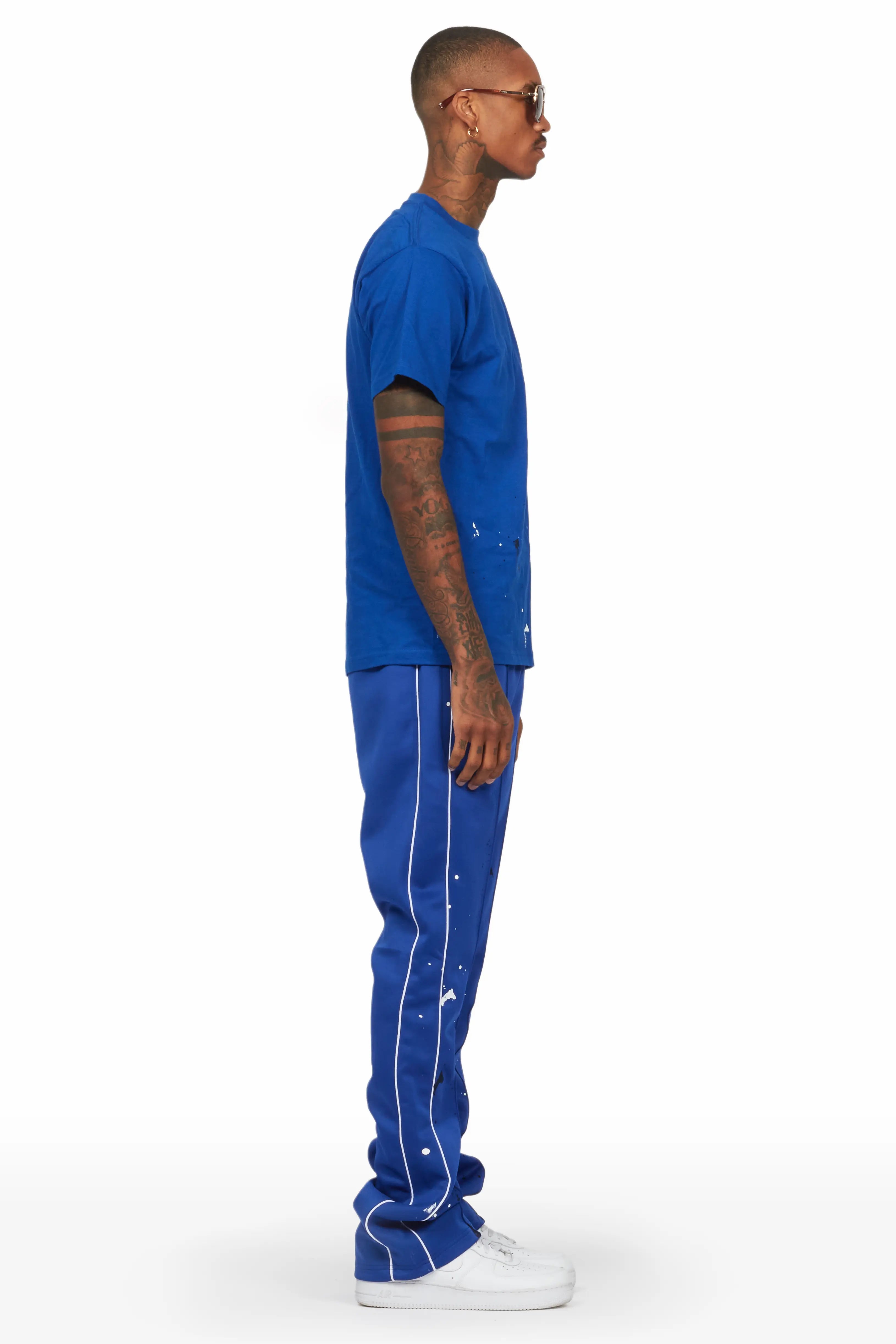 An all-in-one graphic tee and stacked pant set for men. Designed with organic cotton and custom paint detailing for a dope streetwear set.