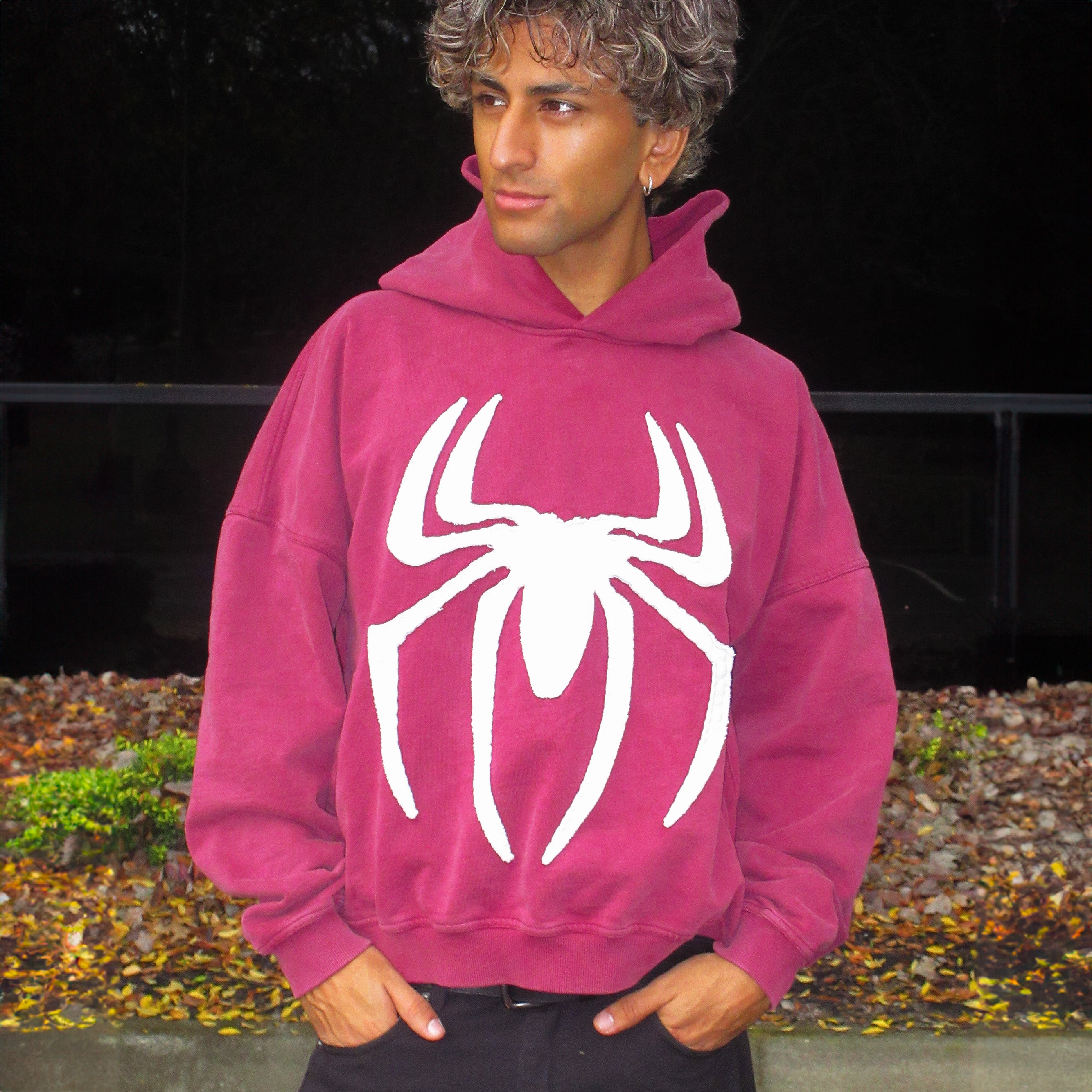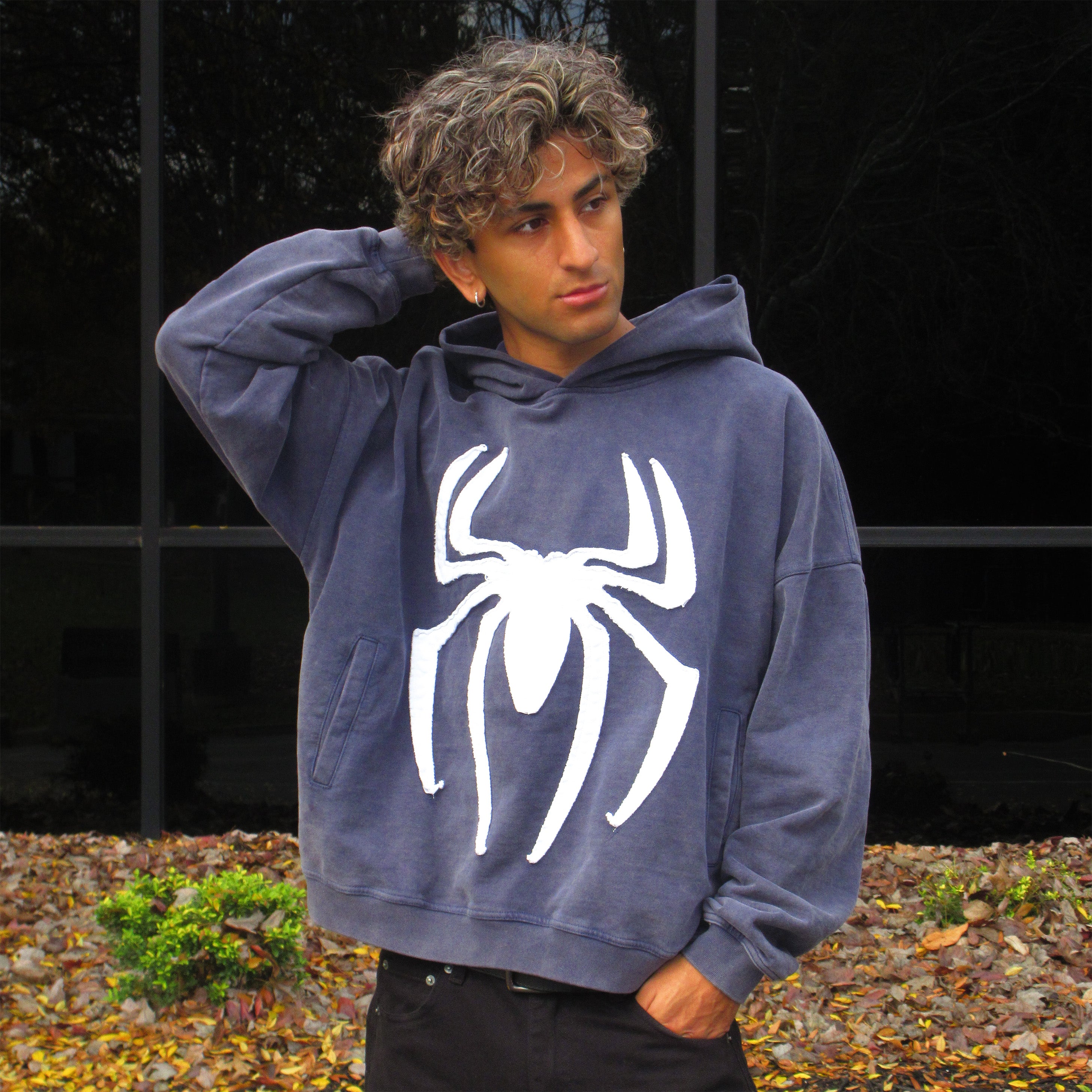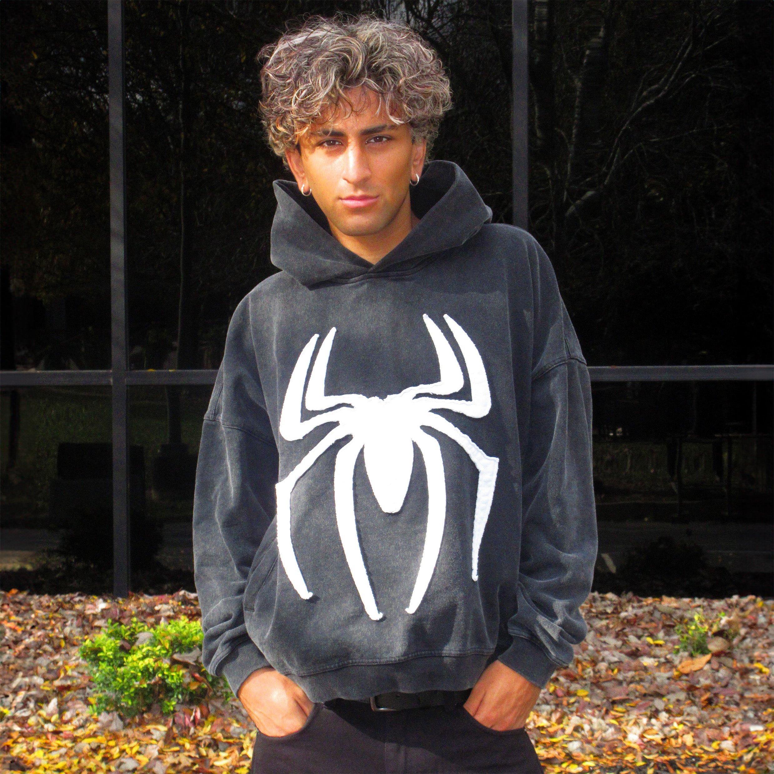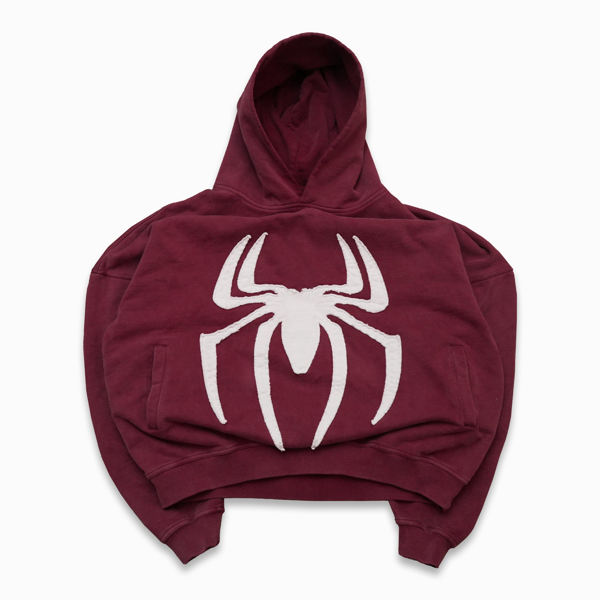 Weight: 450gsm Materials: 100% heavyweight cotton, vintage washed, pre-shrunkDesign Details: White spider appliqué with raised texture, two front side pockets