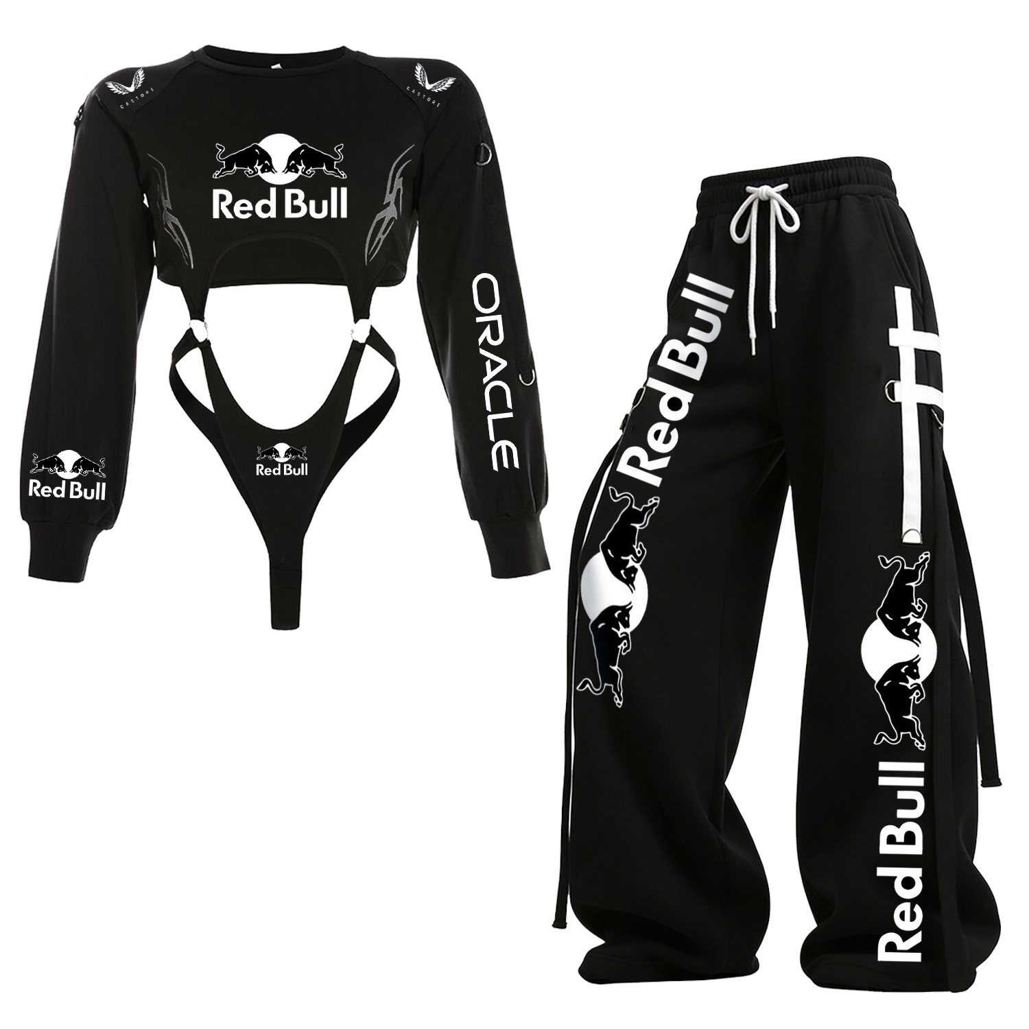 White Racing-Inspired Bodysuit and Sweatpants Set with Bold Logo Design