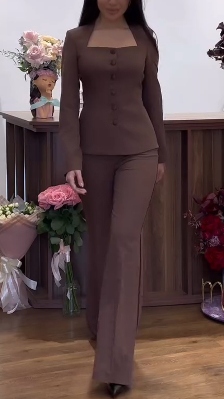 Womens Square Collar Button-down Top + Pants Solid Color Temperament Casual Suit