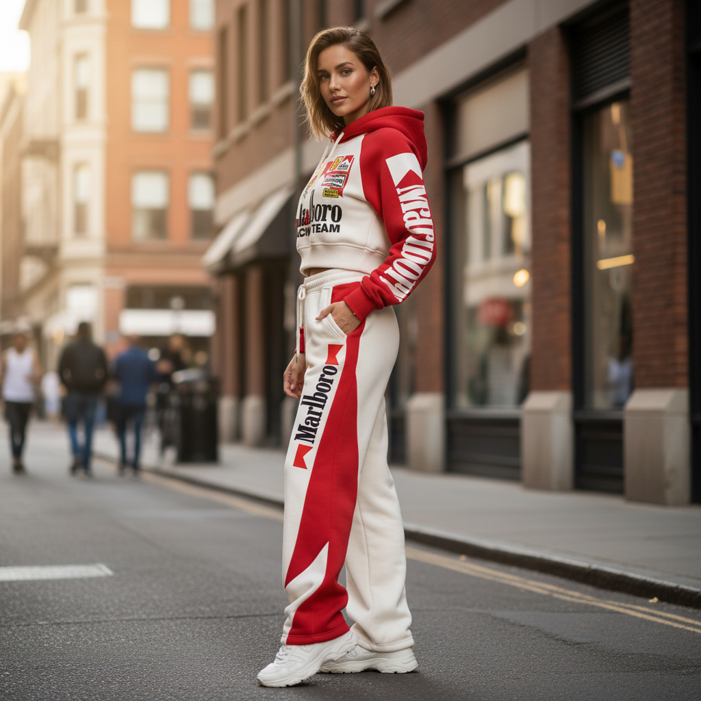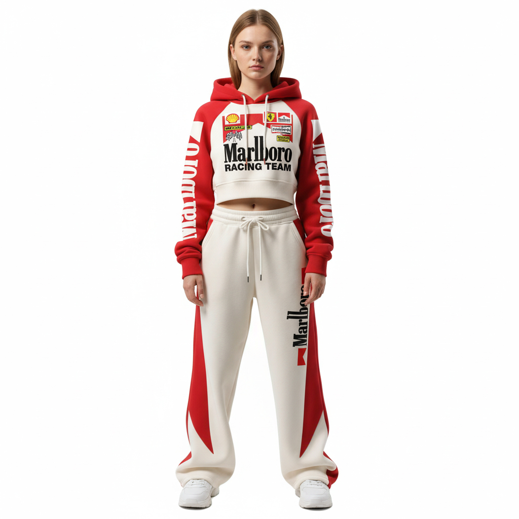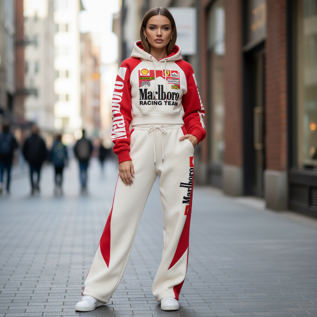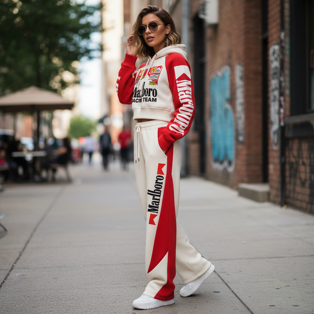 Women's Street Style Casual Racing-Style Printed Suit: Short Hooded Sweatshirt + Wide-Leg Sweatpants